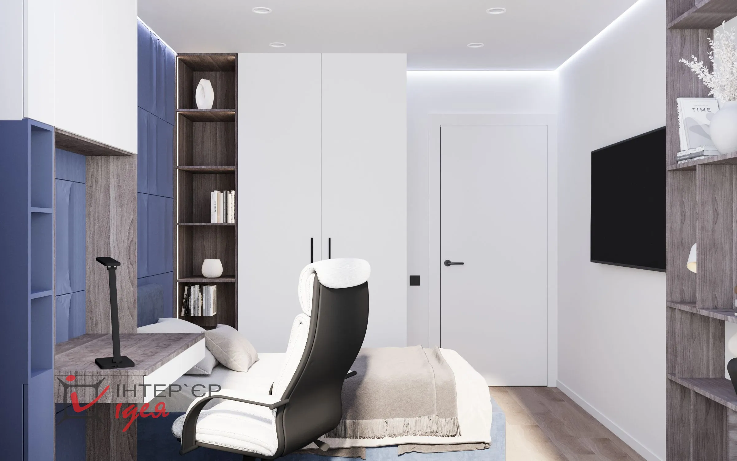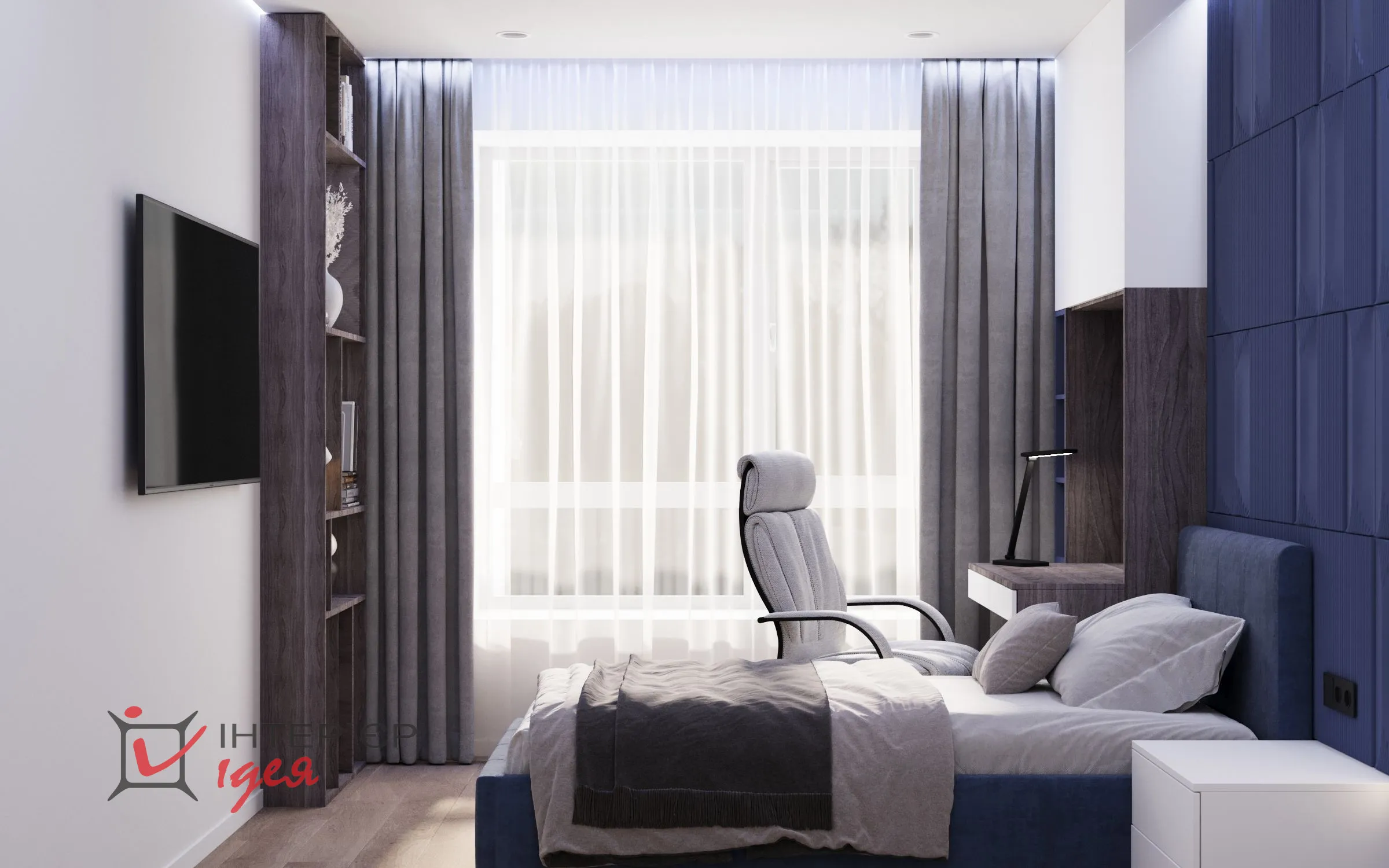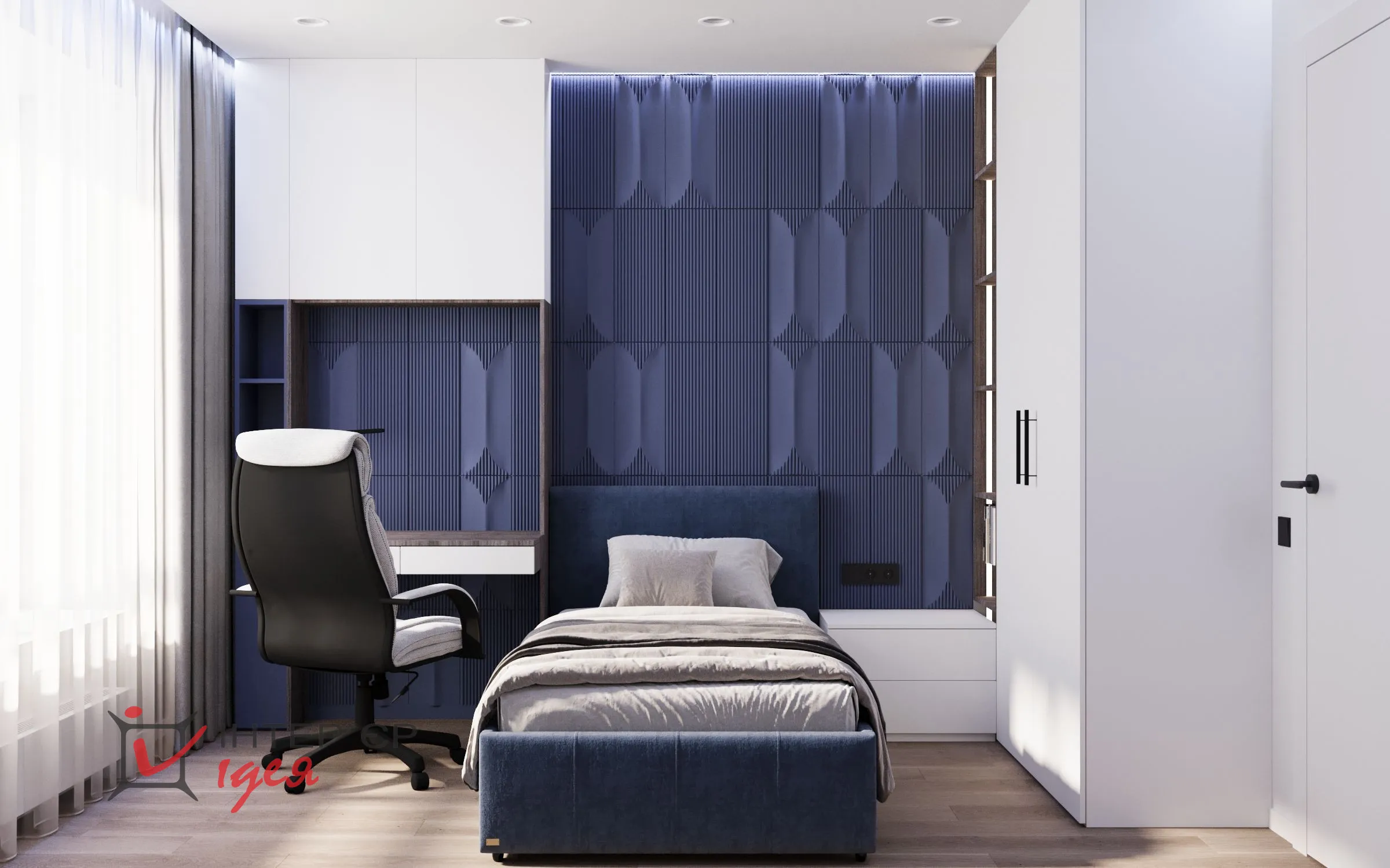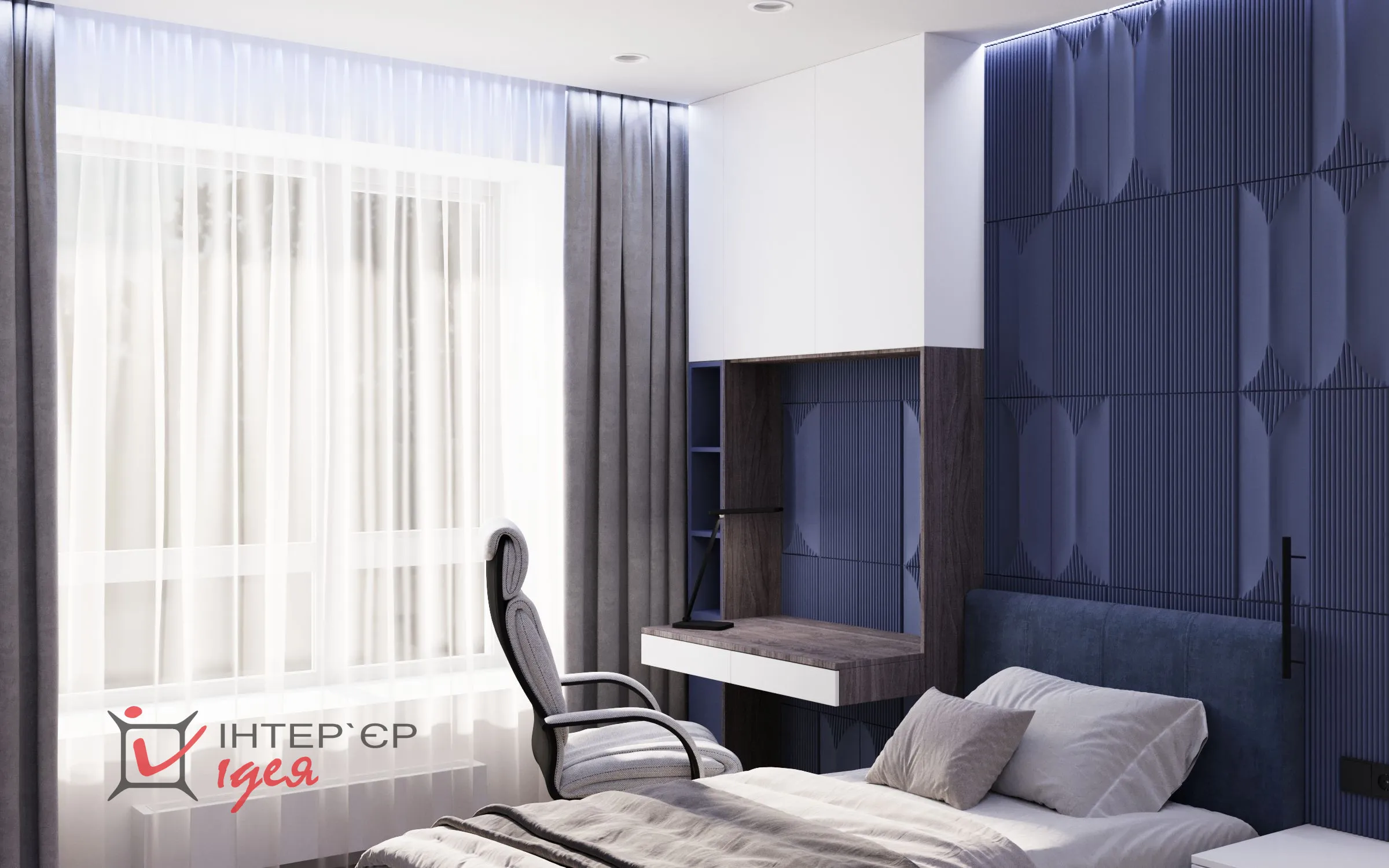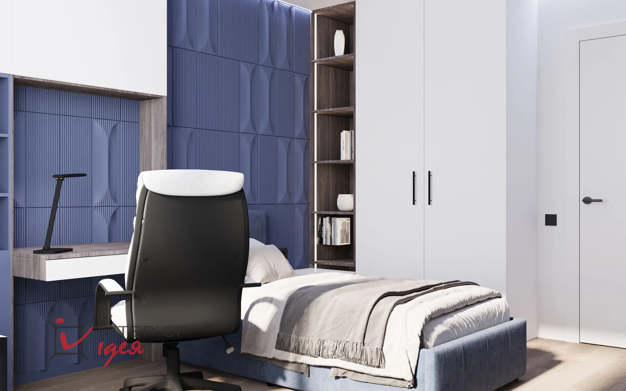 Этот интерьер создан для школьника, поэтому главной задачей было сочетать функциональность, комфорт и характер. Основной акцент в комнате – глубокая синяя гипсовая панель на стене, придающая простор, ритм и выразительность.