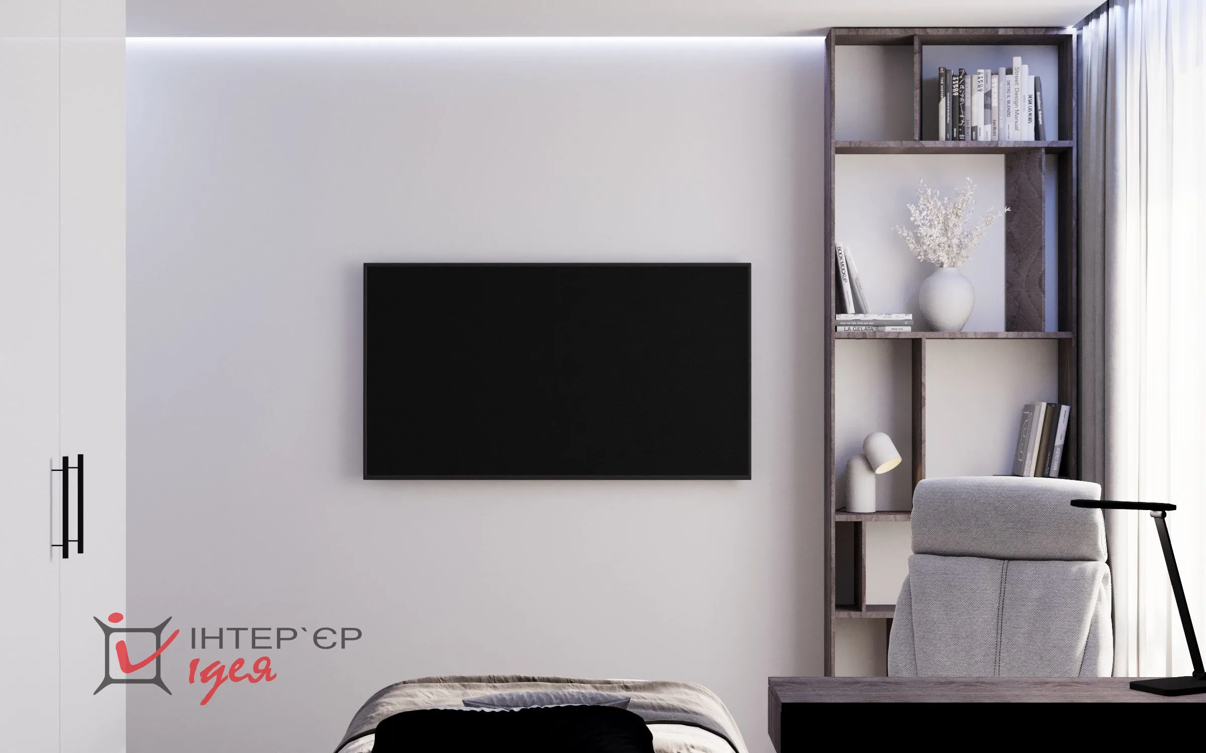 Телевизор, встроенные полки для книг и декора, а также большое окно с плотными шторами и тюлем, делают пространство комфортным и для обучения, и для отдыха. Здесь каждый элемент имеет свою функцию, но не перегружает общую атмосферу.