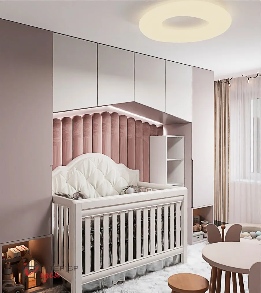 В предложении учитывались возрастные изменения, ведь со временем часть мебели останется, а детская кроватка, пелинальный комод заменится на большую мебель. Добавили рабочий стол для обучения.