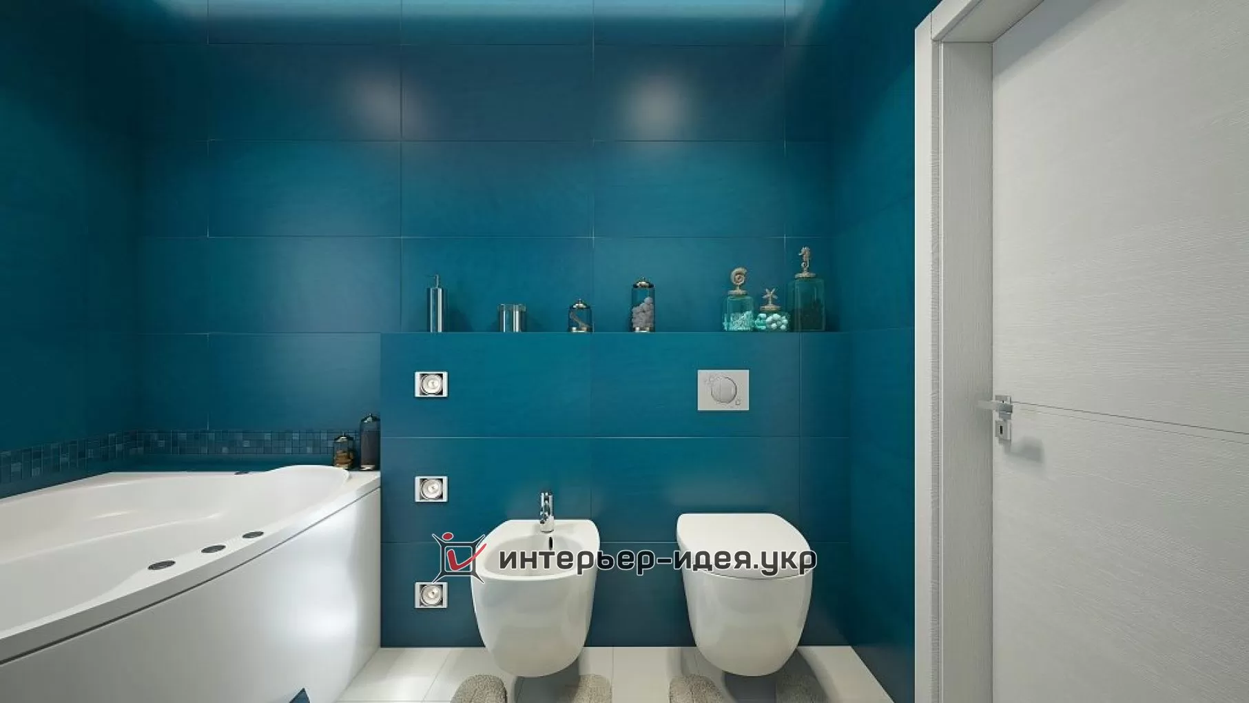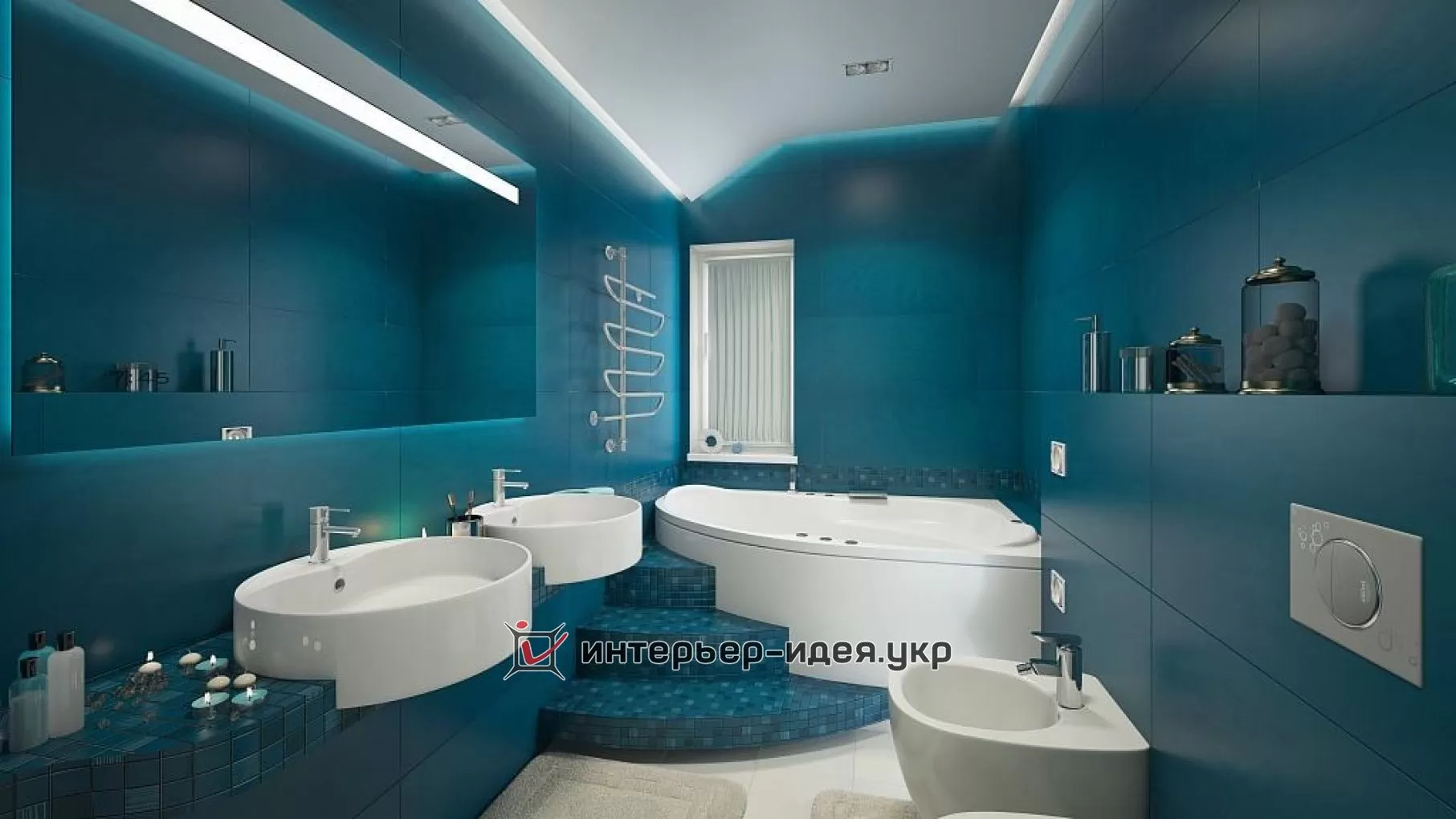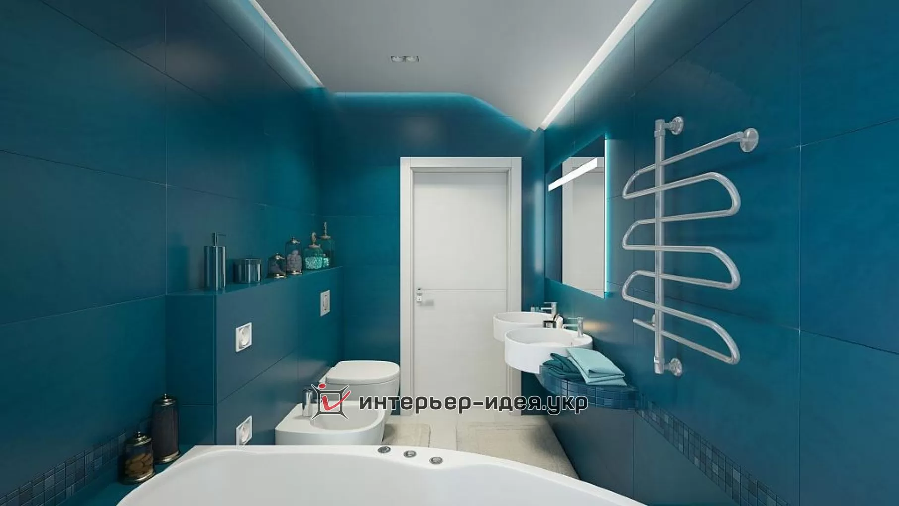 Дизайн синей современной ванной прямоугольной формы с белой сантехникой
