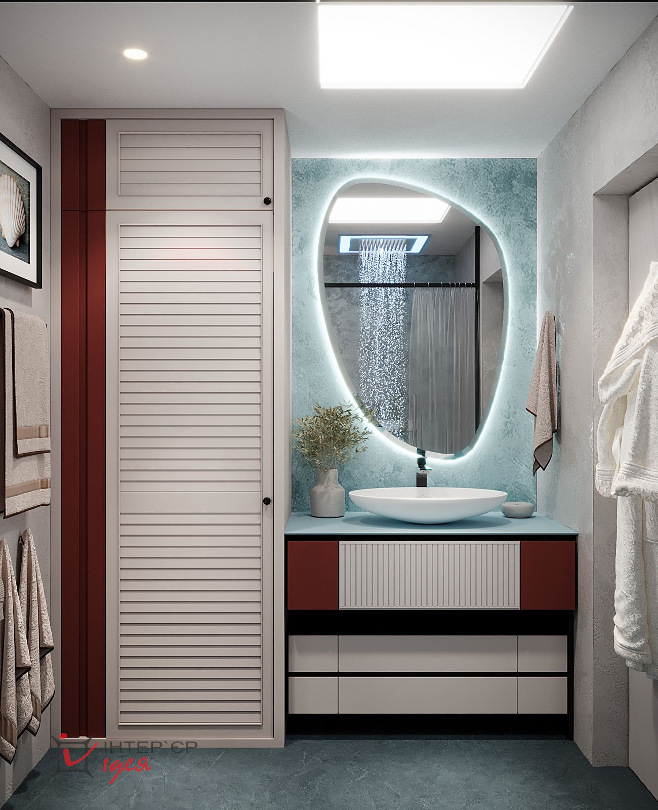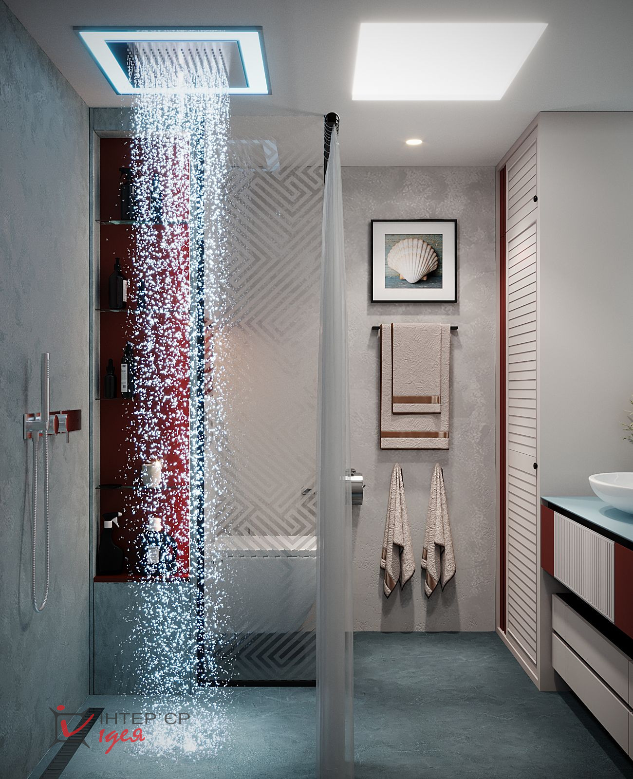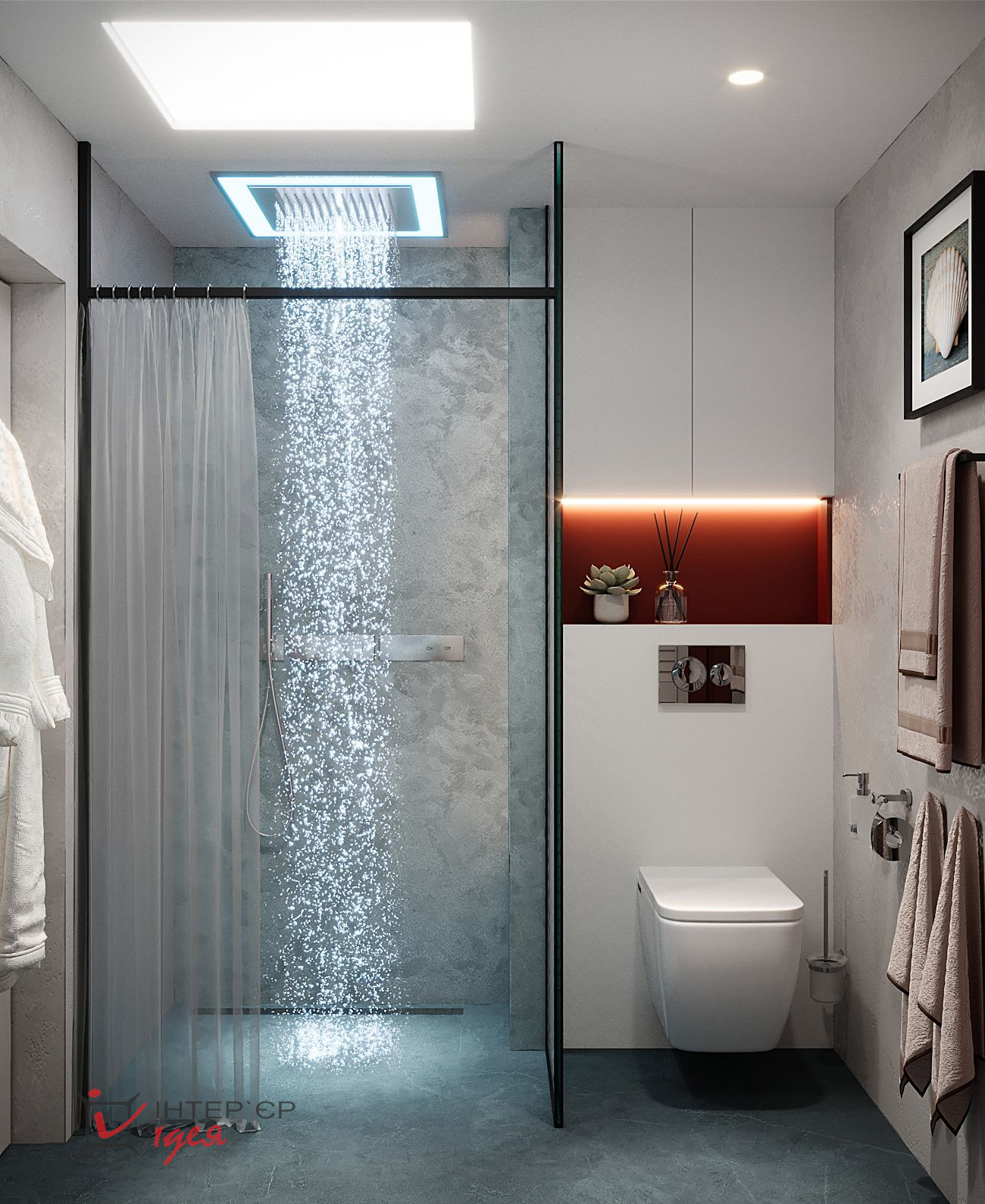 Душевая кабина освещается из светодиодного профиля в виде квадрата вокруг тропического душа и светодиодной подсветкой ниши для хранения моющих средств. Вместо полотенцесушителя предусмотрена теплая стена напротив входной двери.