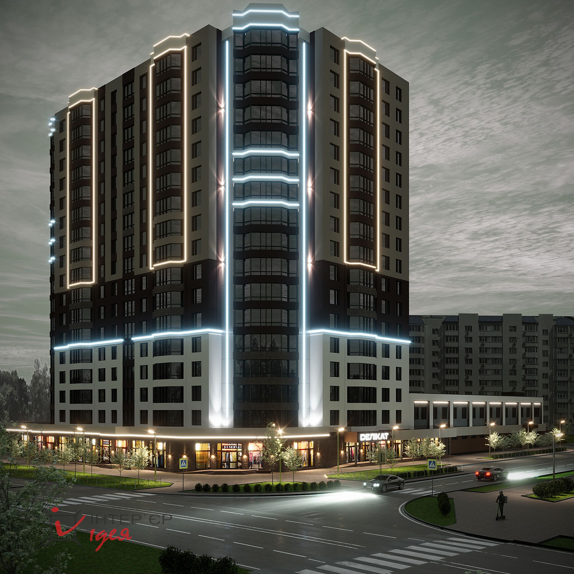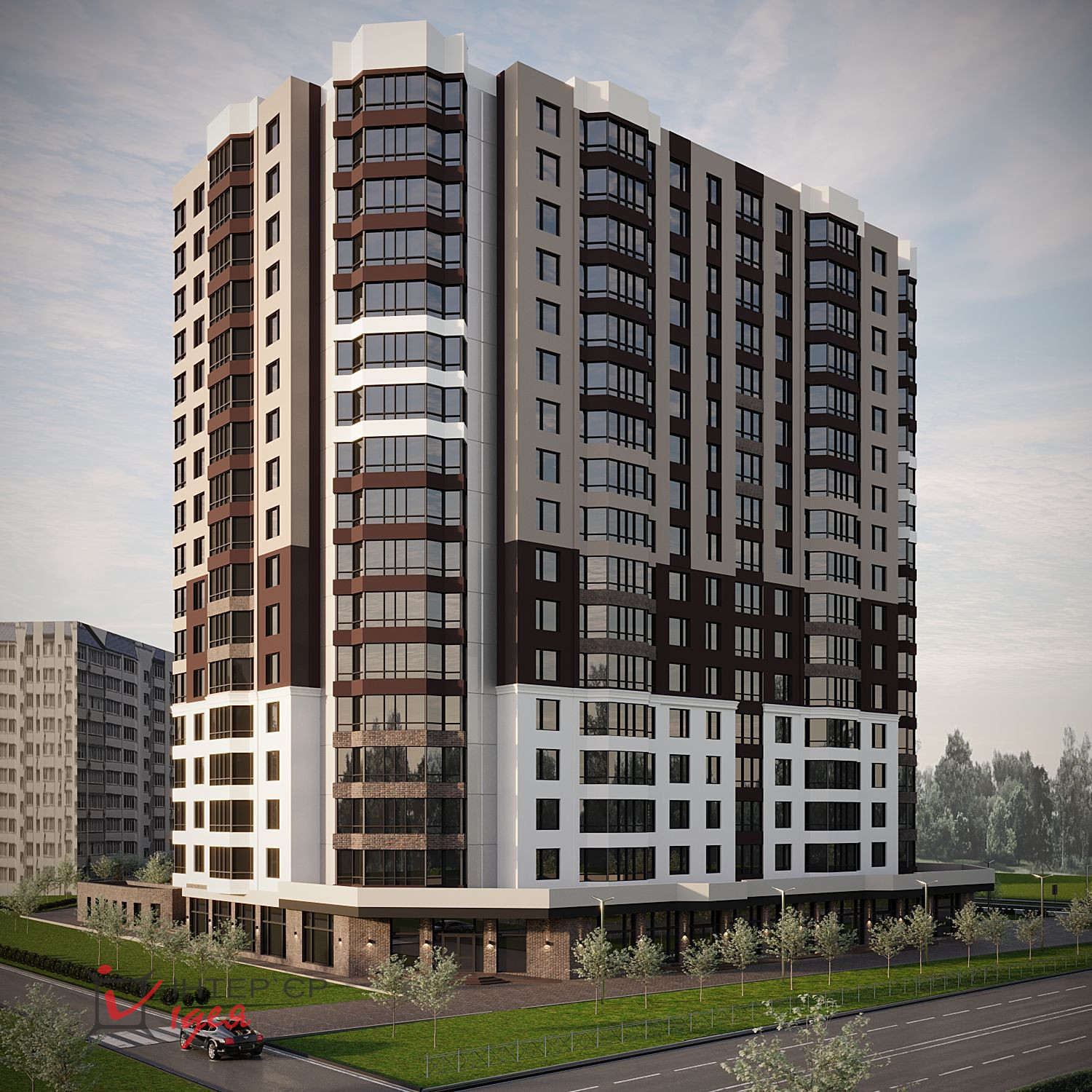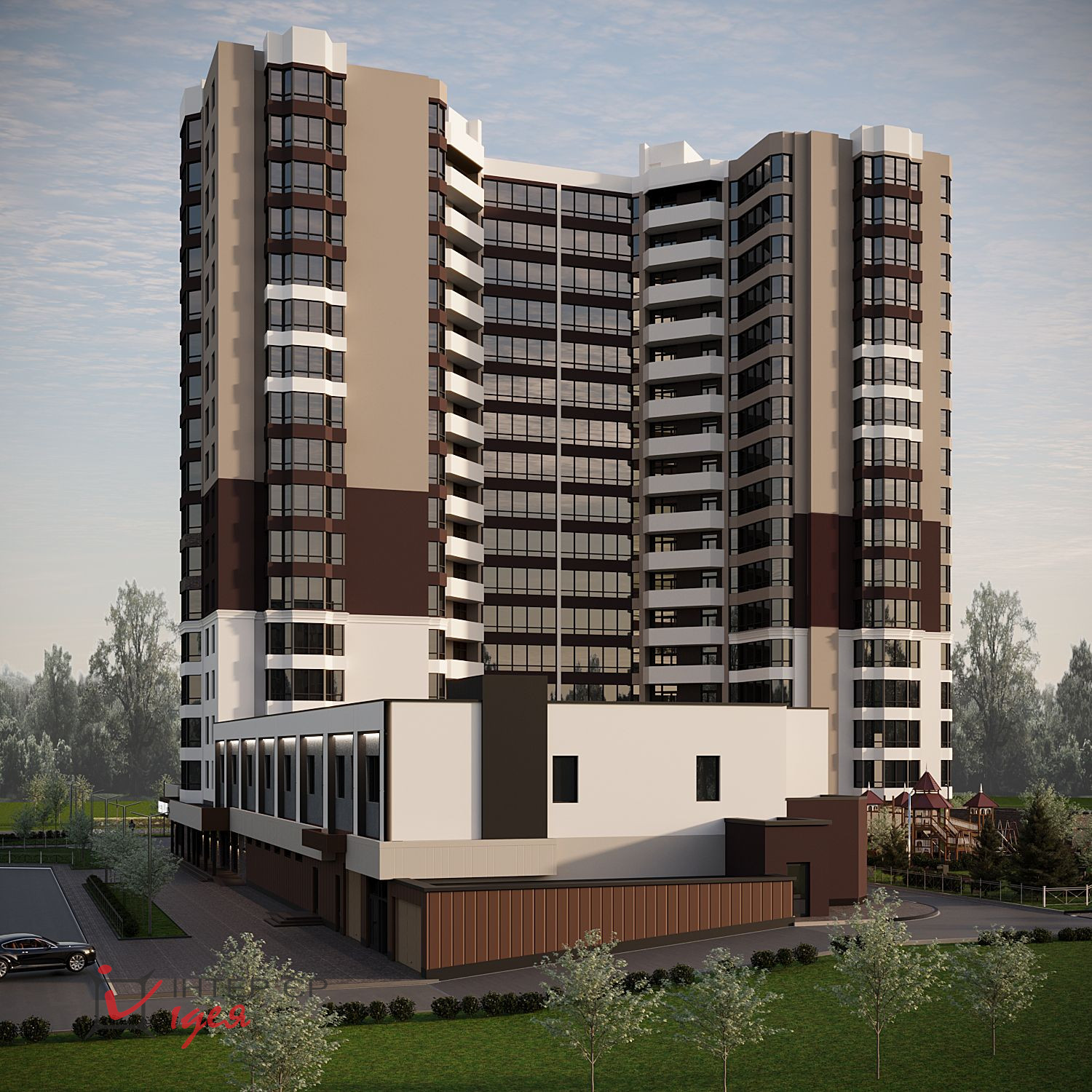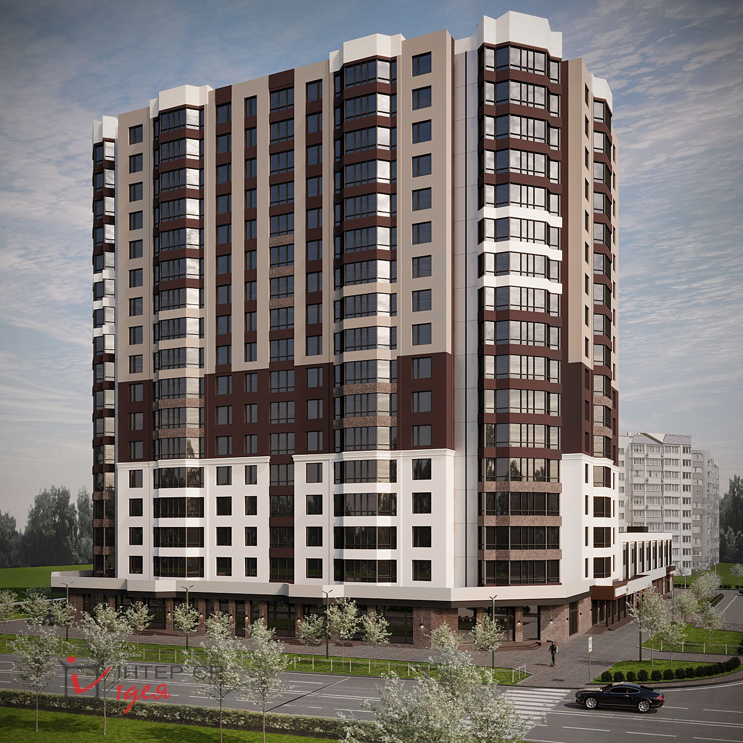 По бокам от угловых эркеров для обработки используется композит серебристого цвета, подчеркивающий колорит здания и визуально сочетающий его с пристройкой коммерческого назначения, частично обработанной серым цветом.