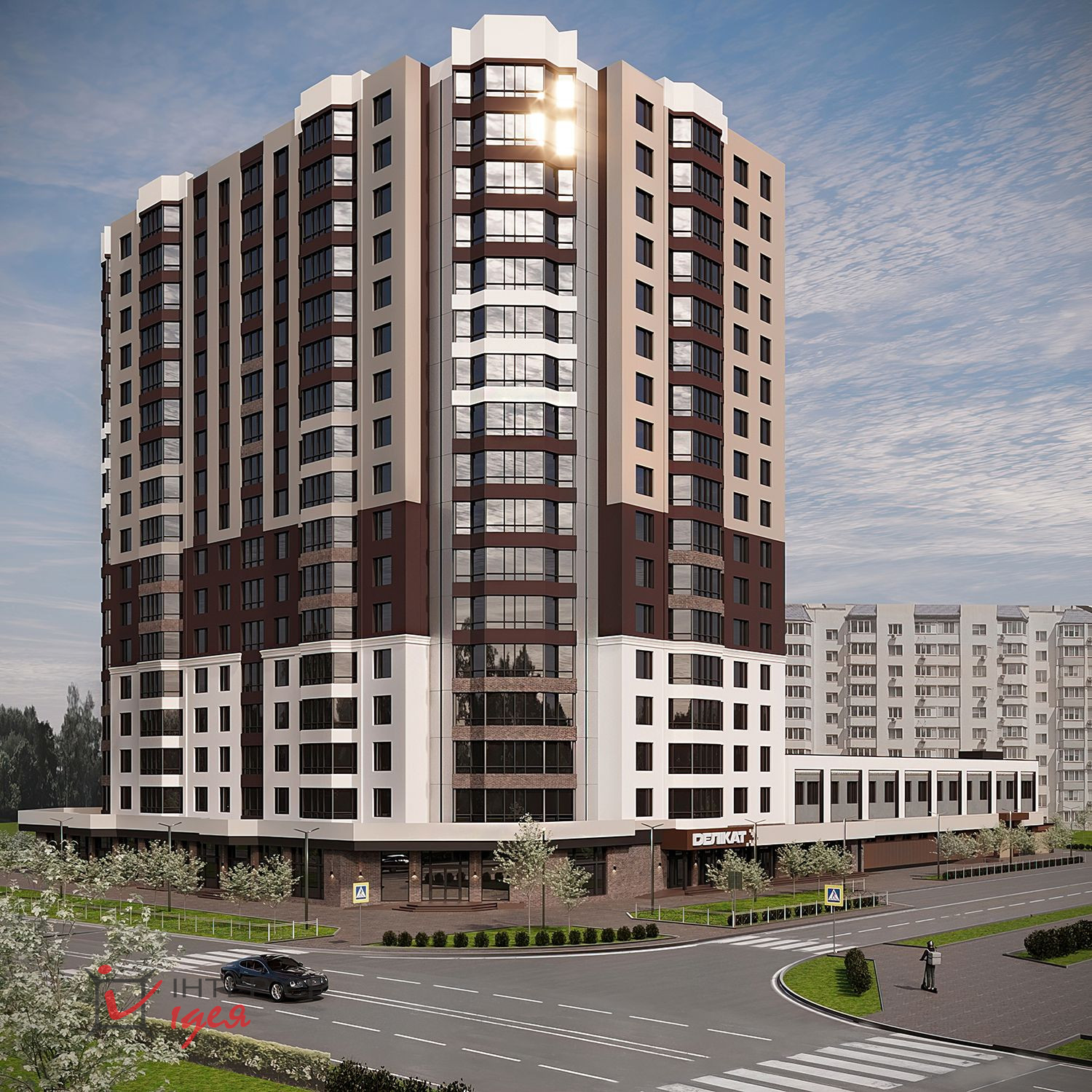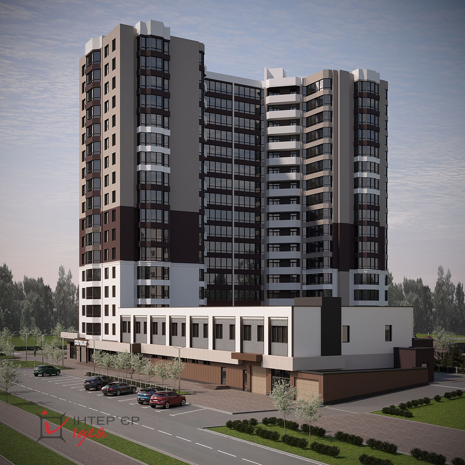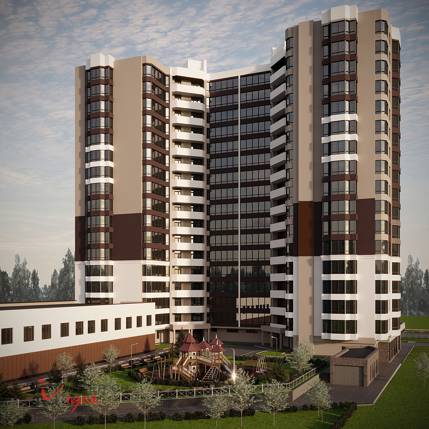 По бокам от угловых эркеров для обработки используется композит серебристого цвета, подчеркивающий колорит здания и визуально сочетающий его с пристройкой коммерческого назначения, частично обработанной серым цветом.