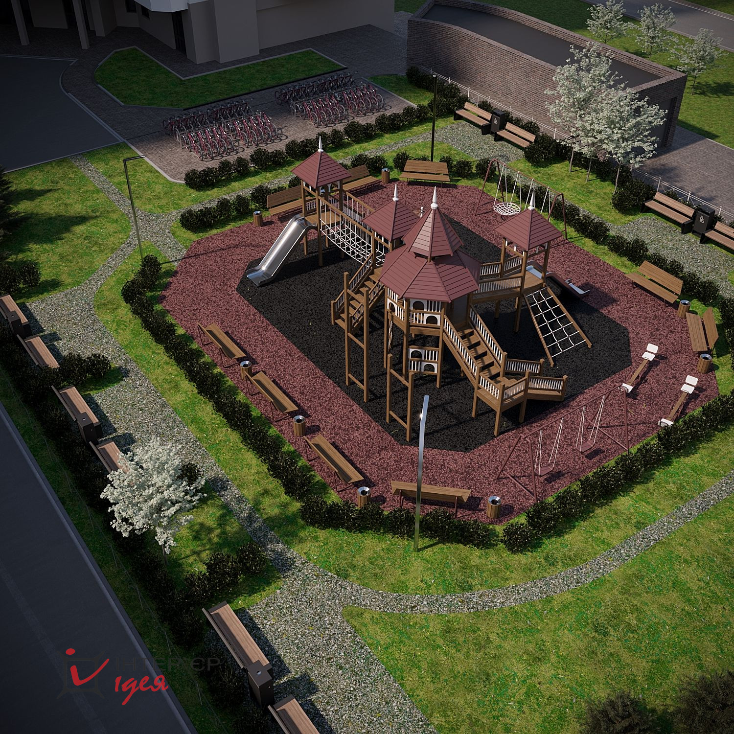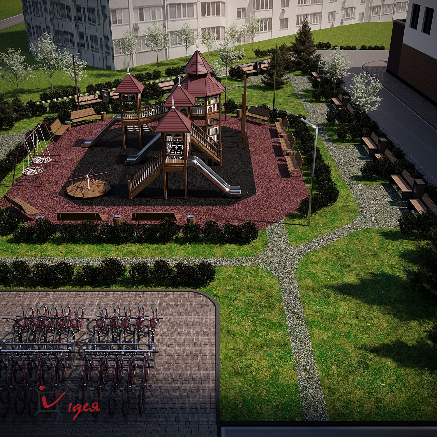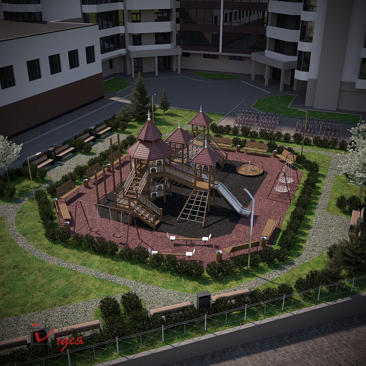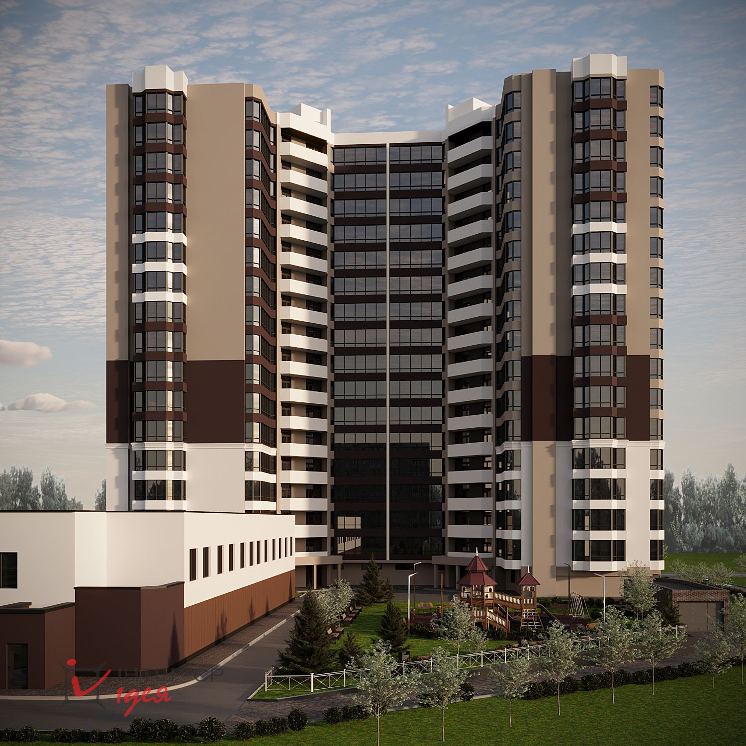 По бокам от угловых эркеров для обработки используется композит серебристого цвета, подчеркивающий колорит здания и визуально сочетающий его с пристройкой коммерческого назначения, частично обработанной серым цветом.
