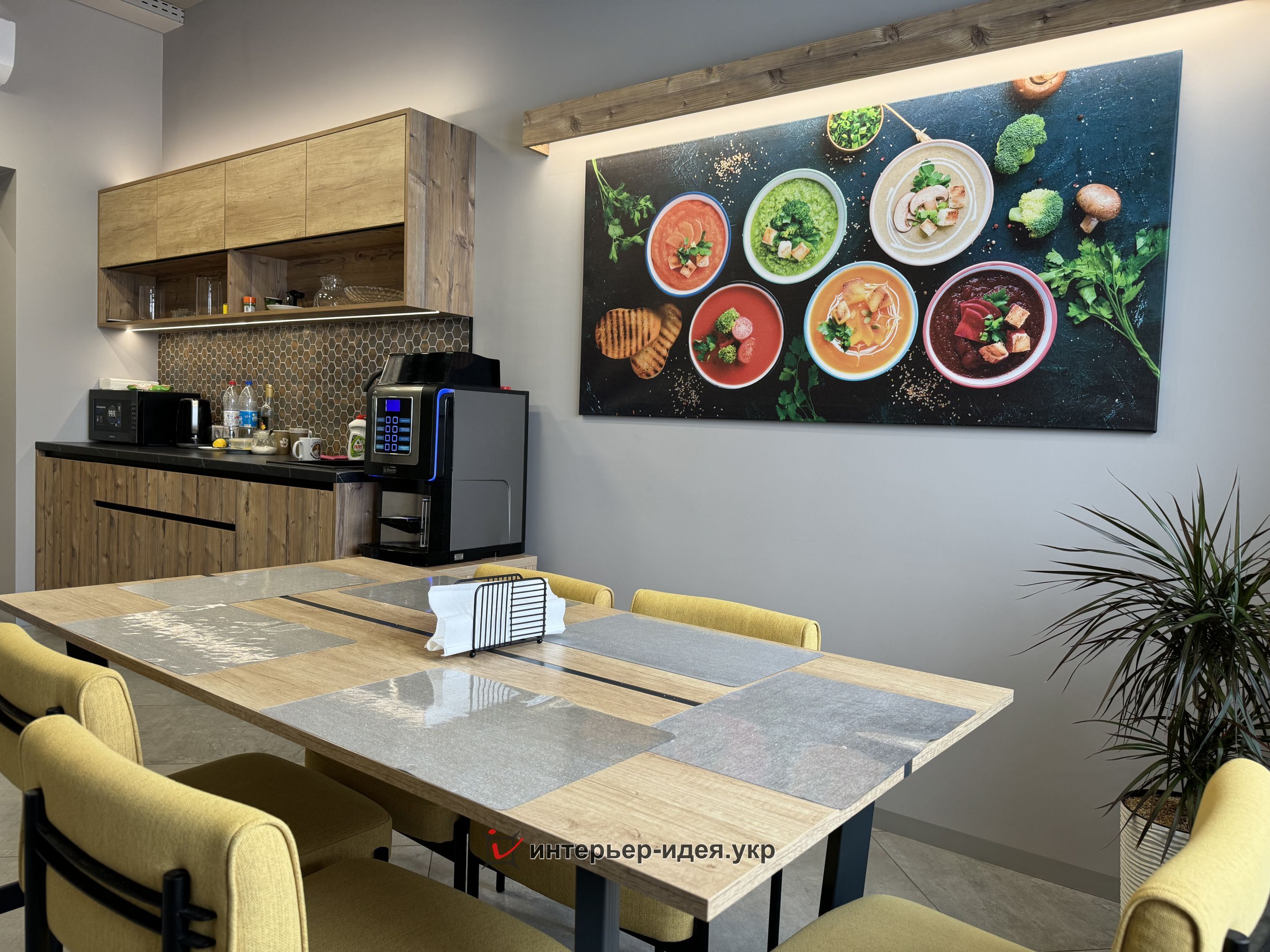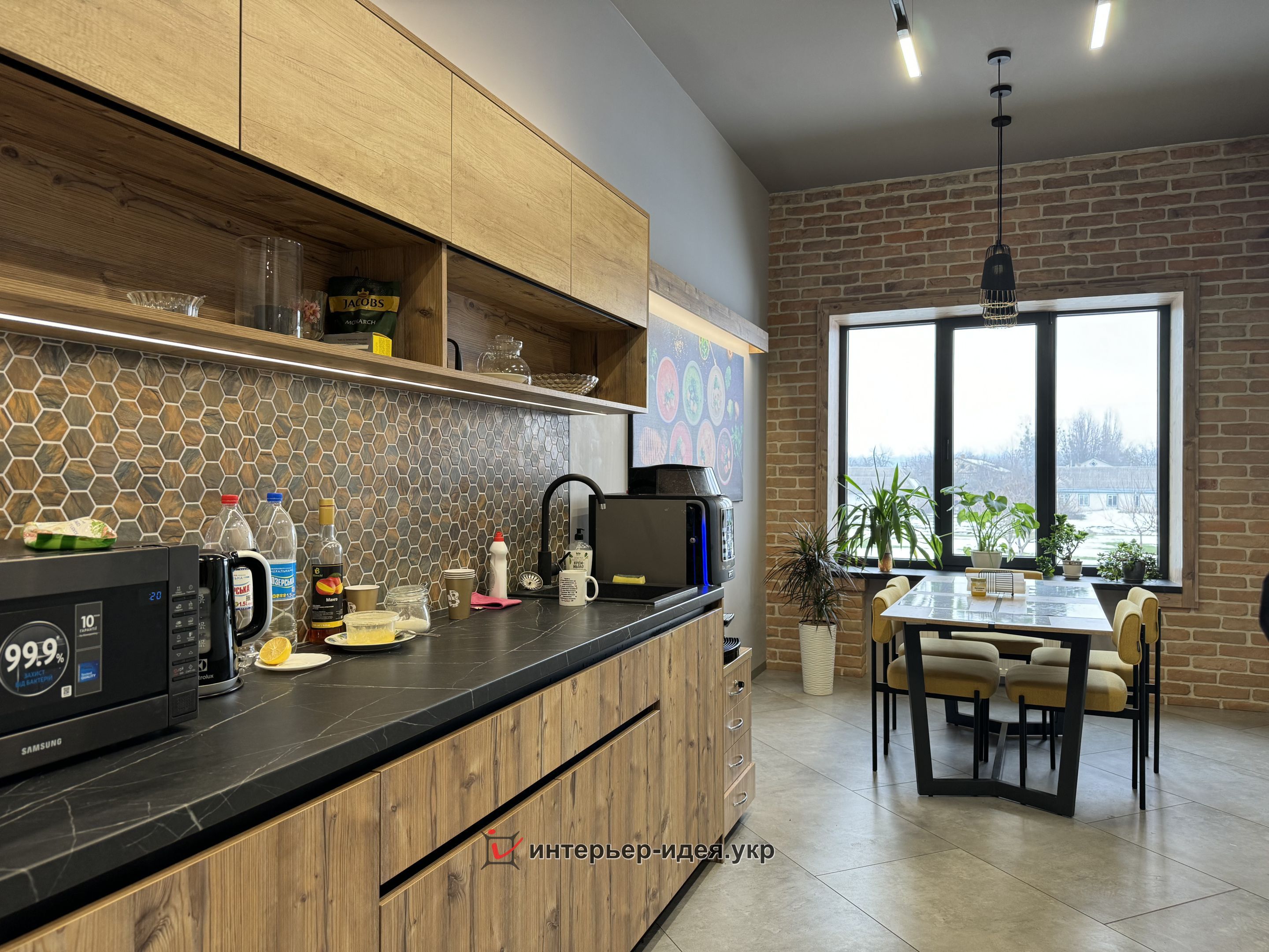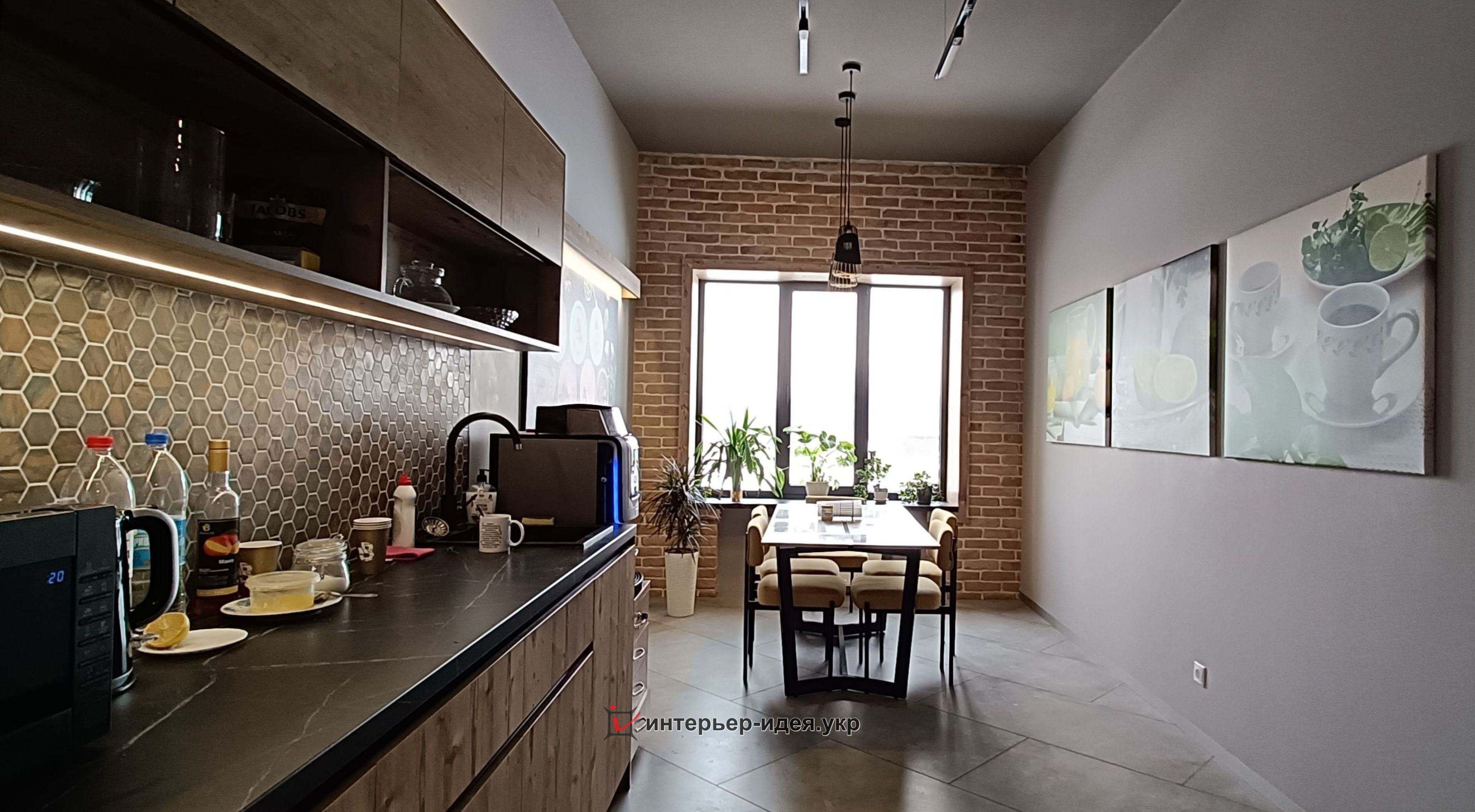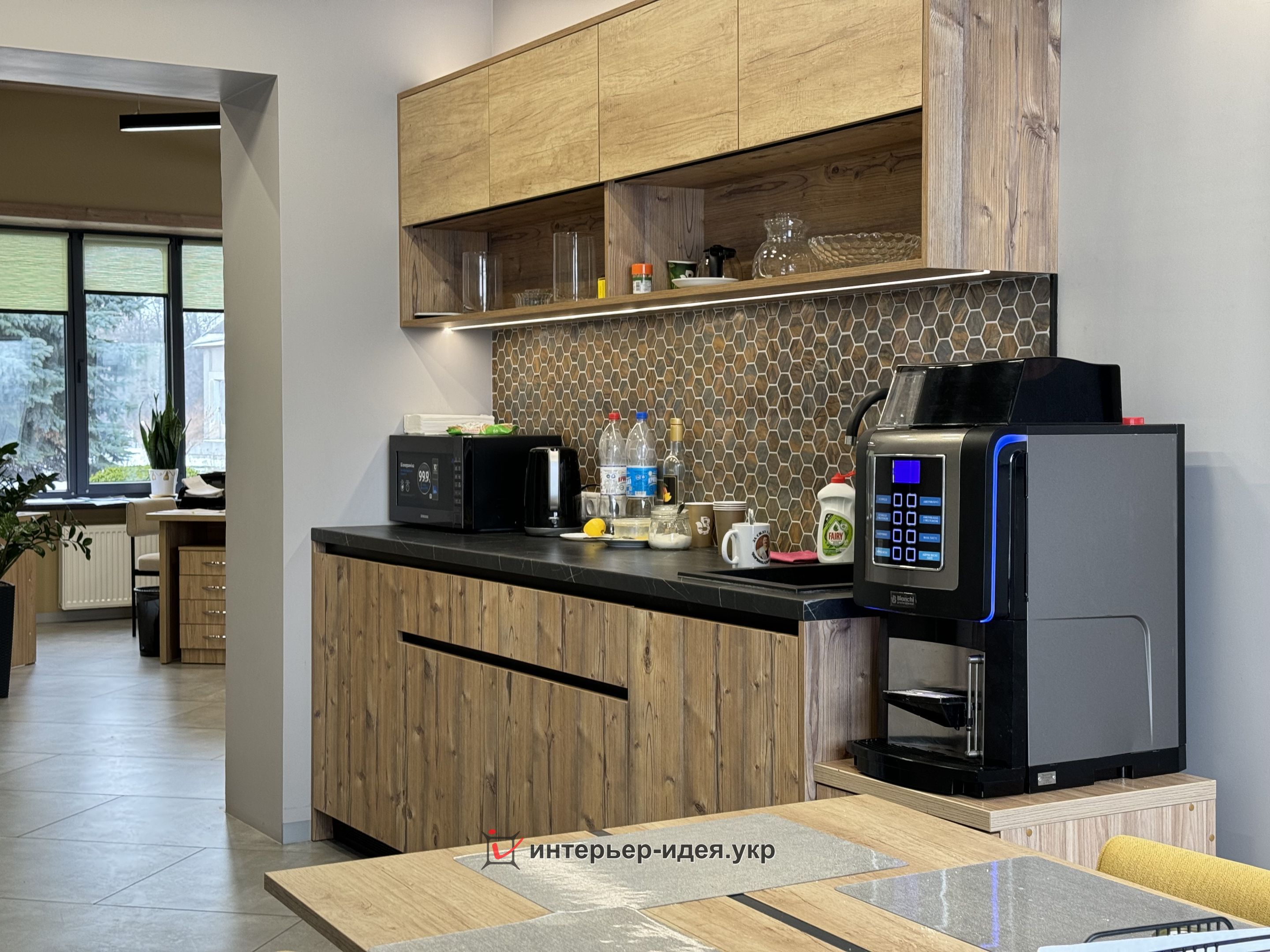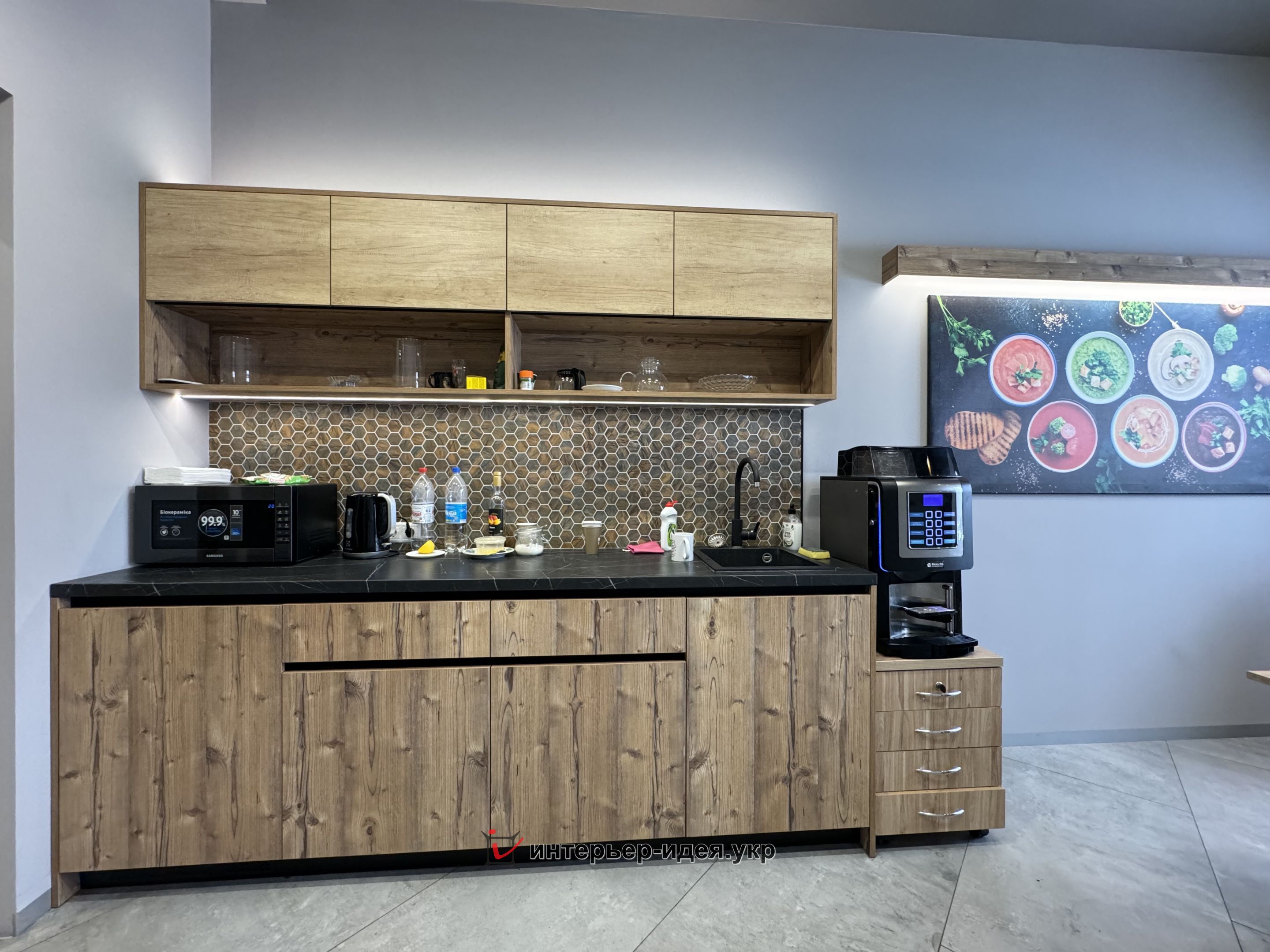 В кухне расположен маленький холодильник. В подвесных полках находится открытое пространство для удобного размещения чайных пакетиков, сахара и других вкусностей в быстрой доступности. На столешнице достаточно места для размещения микроволновки, кофемашины и чайника.