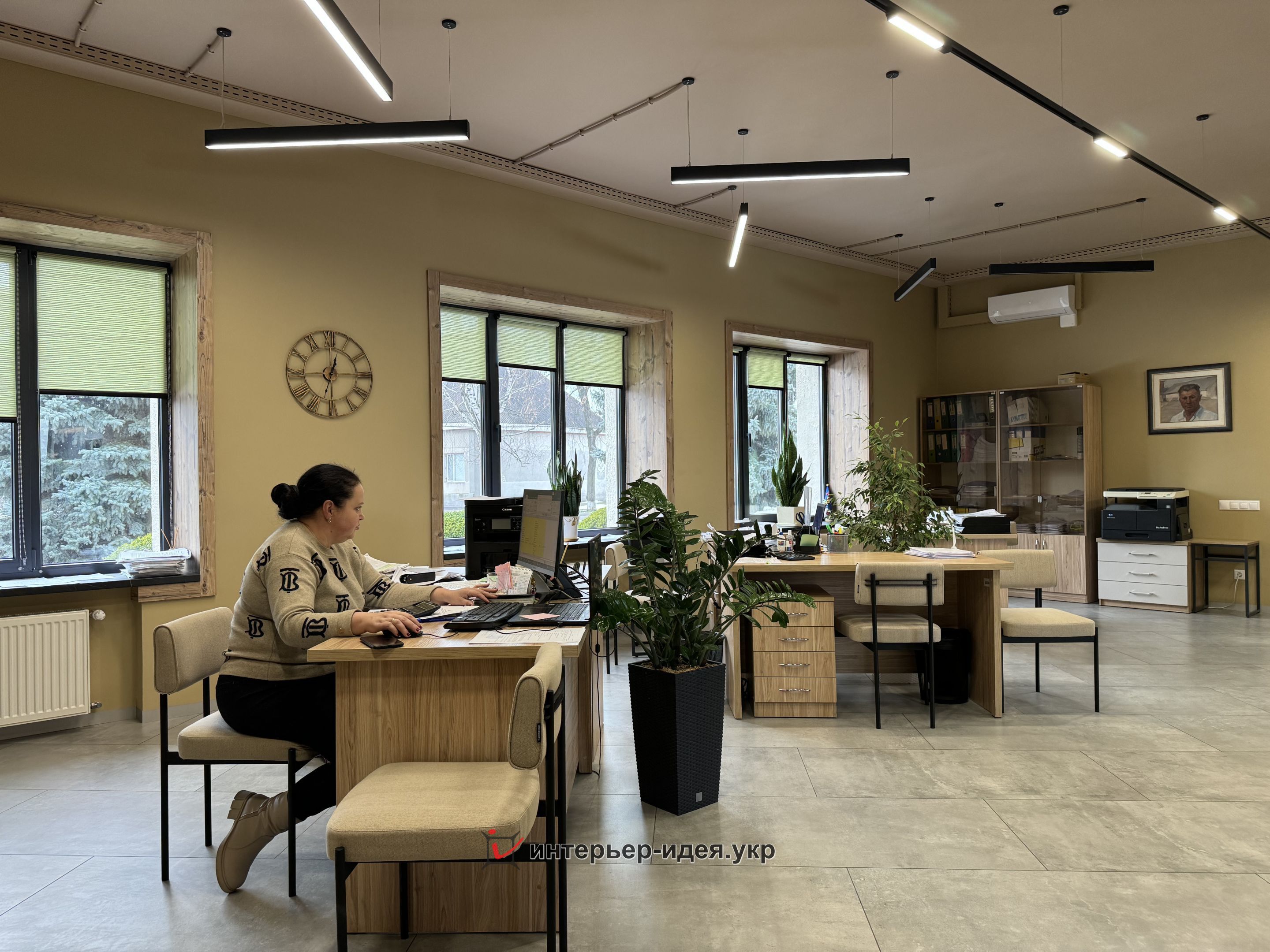 Рабочее пространство между работниками поделено мебельным коробом в металлической раме для поддержания единого стиля в интерьере с использованием живых растений.