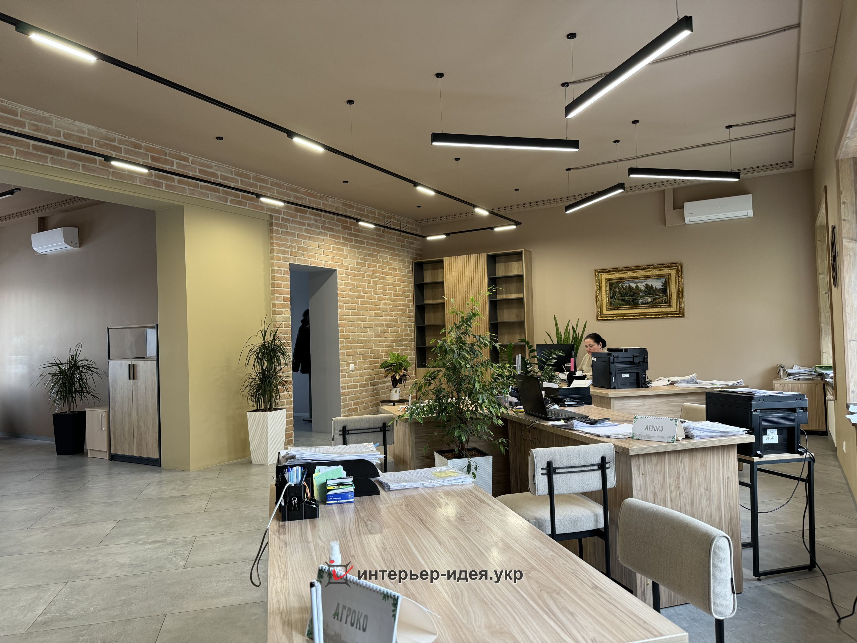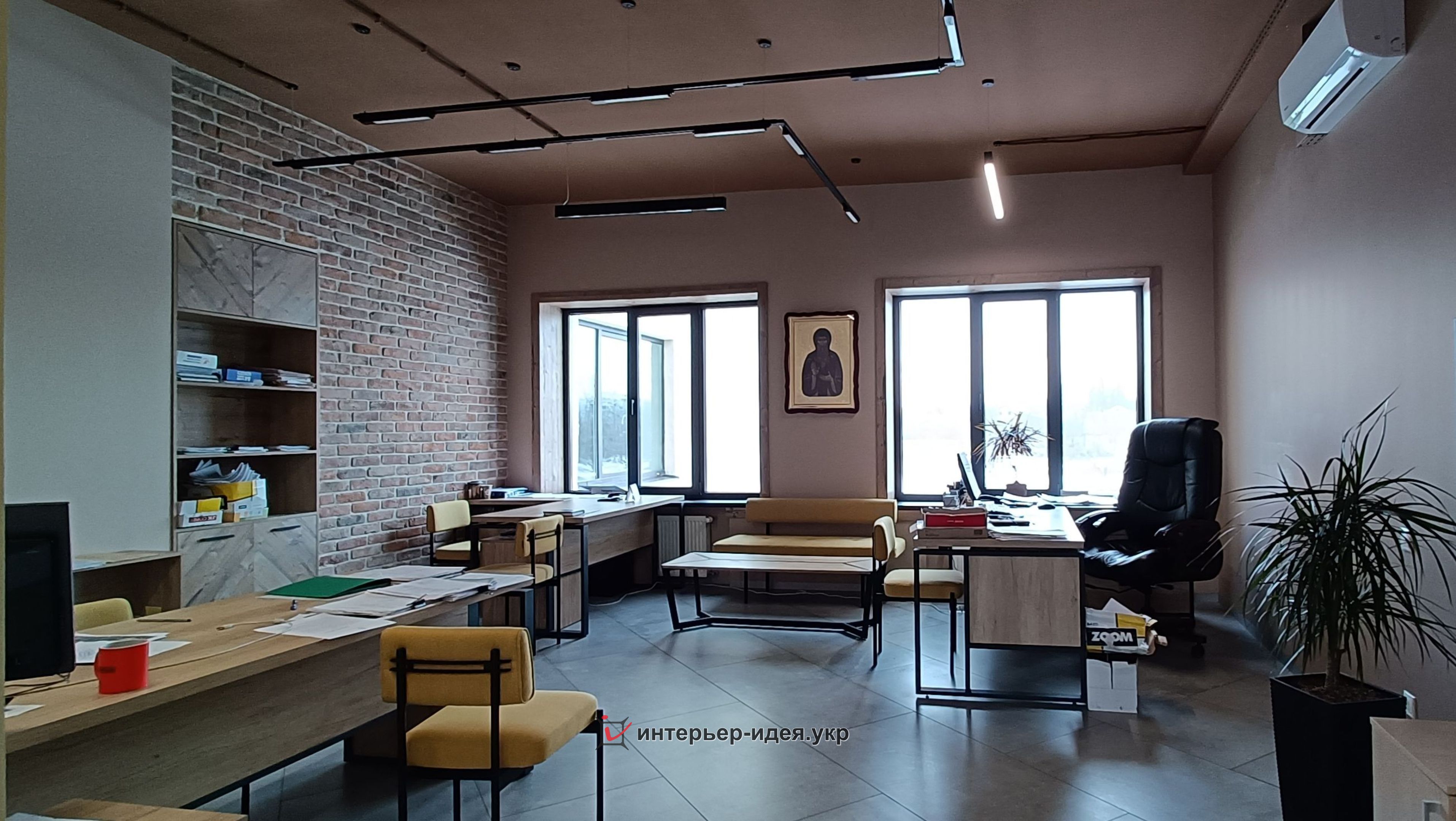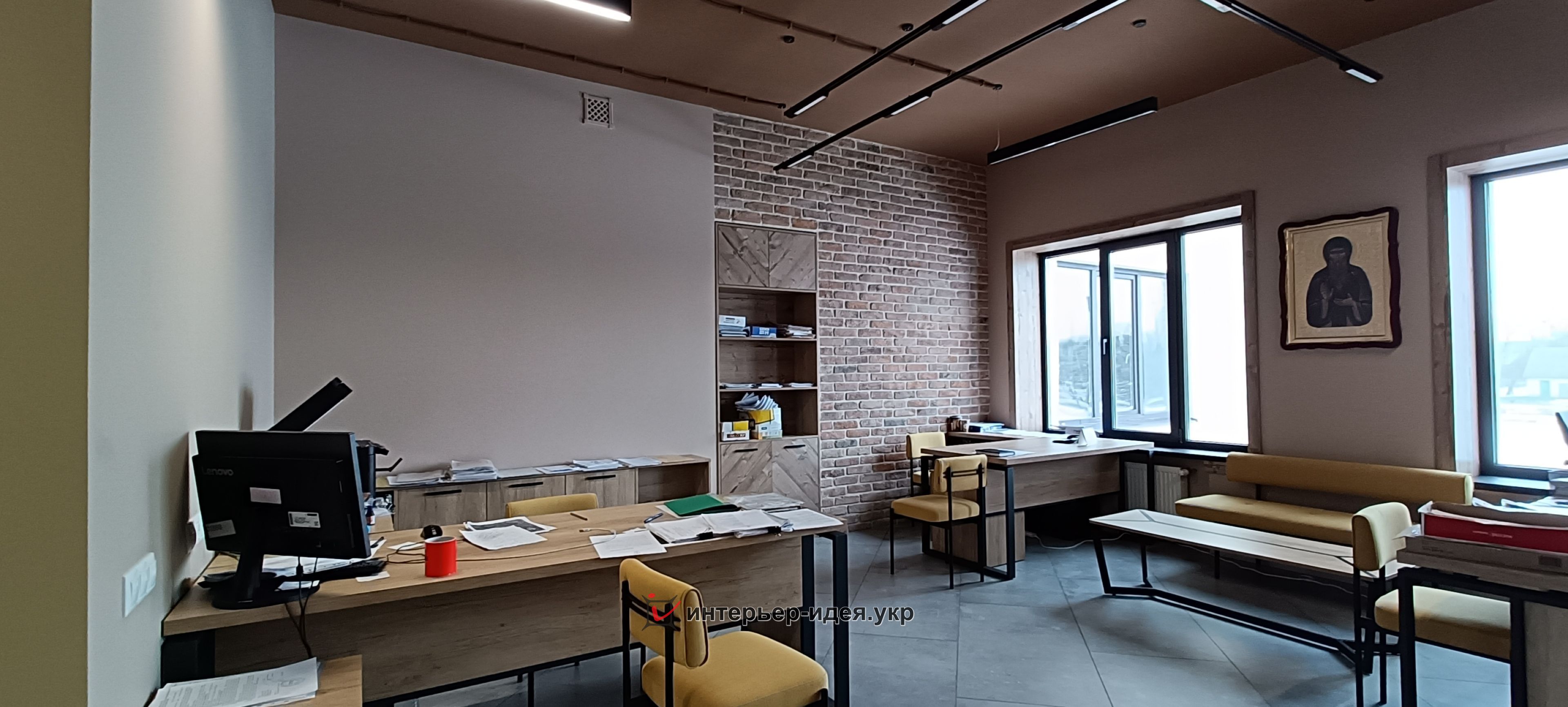 По рабочему месту главного юриста гипсокартонная конструкция с подсветкой, образующая интересный рельеф на стене.