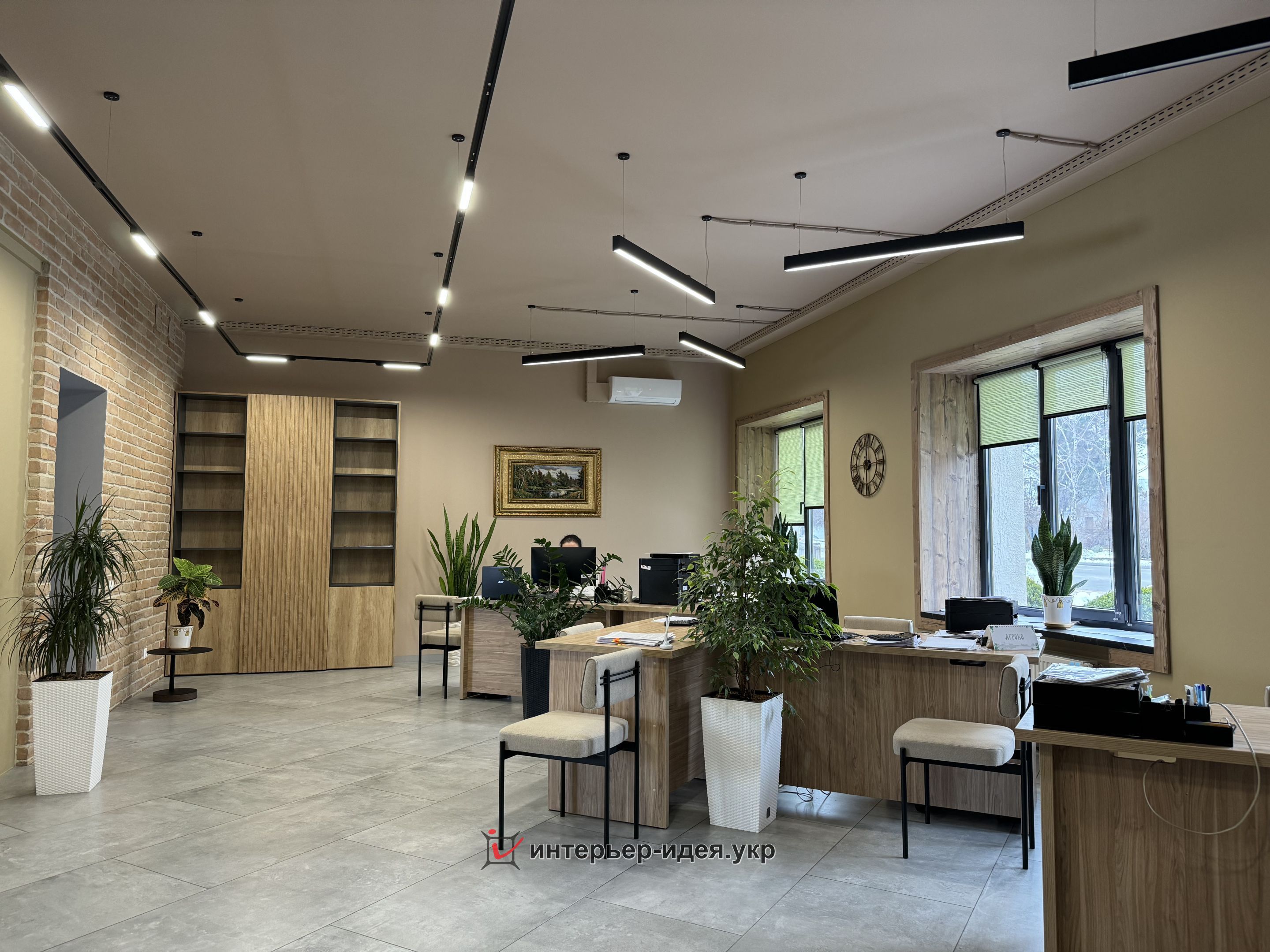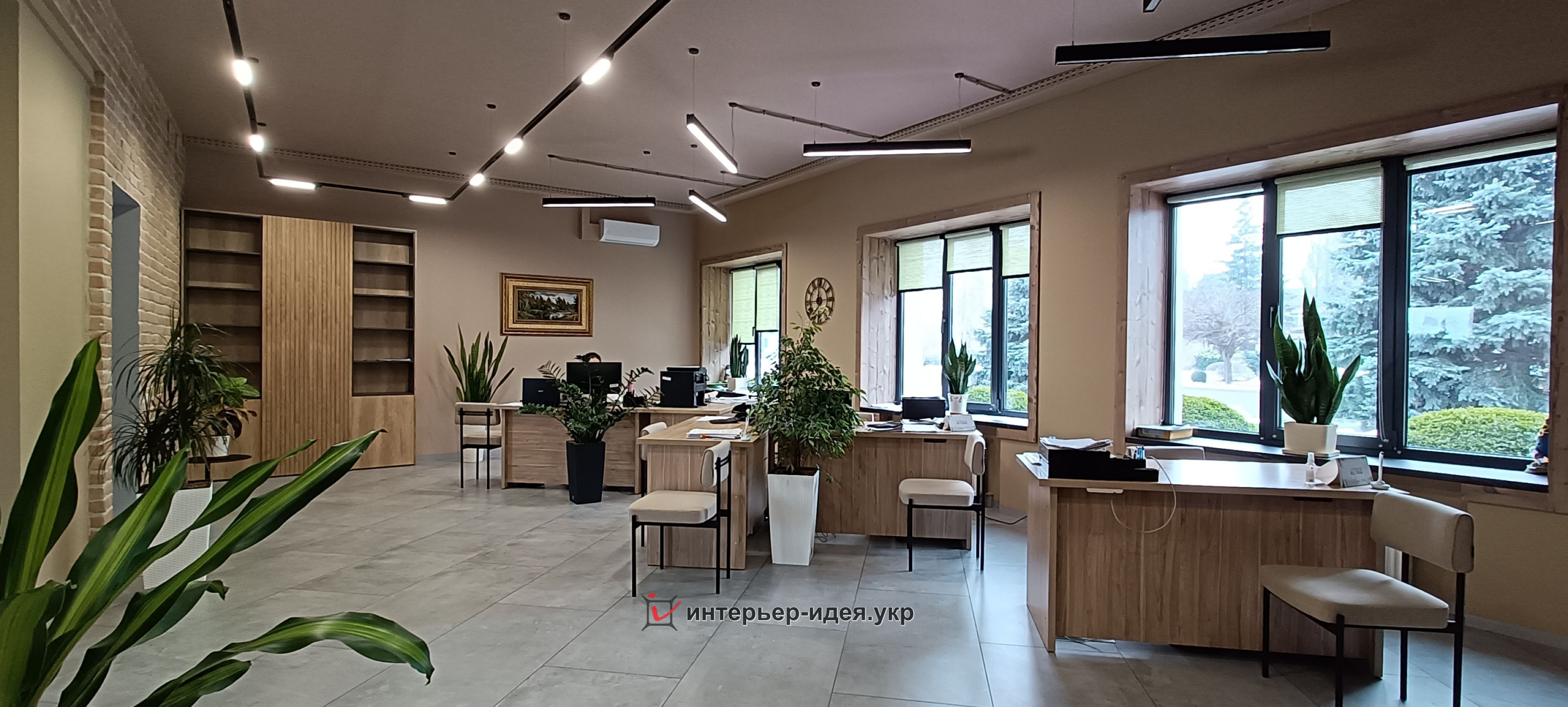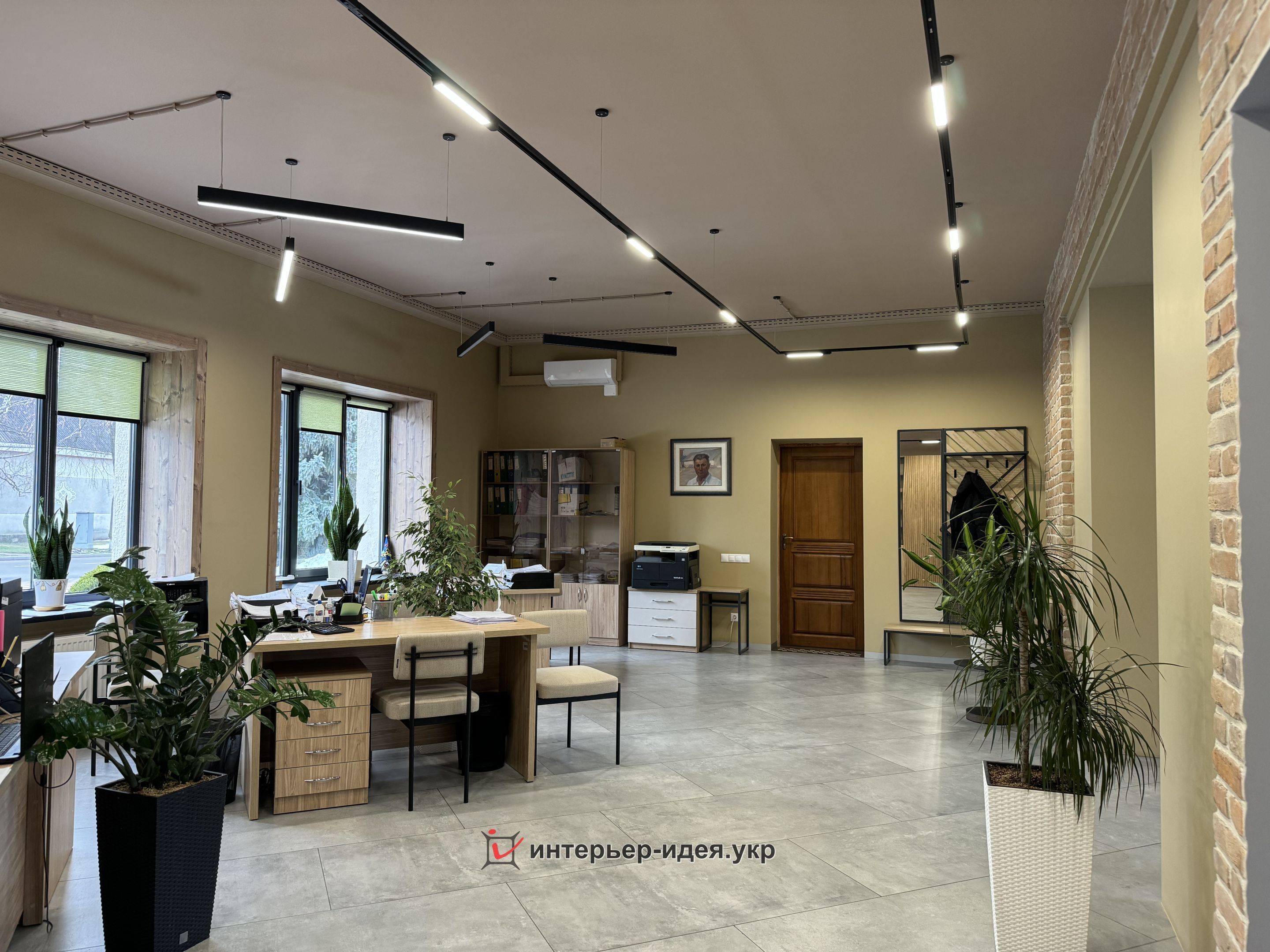 По рабочему месту главного юриста гипсокартонная конструкция с подсветкой, образующая интересный рельеф на стене.