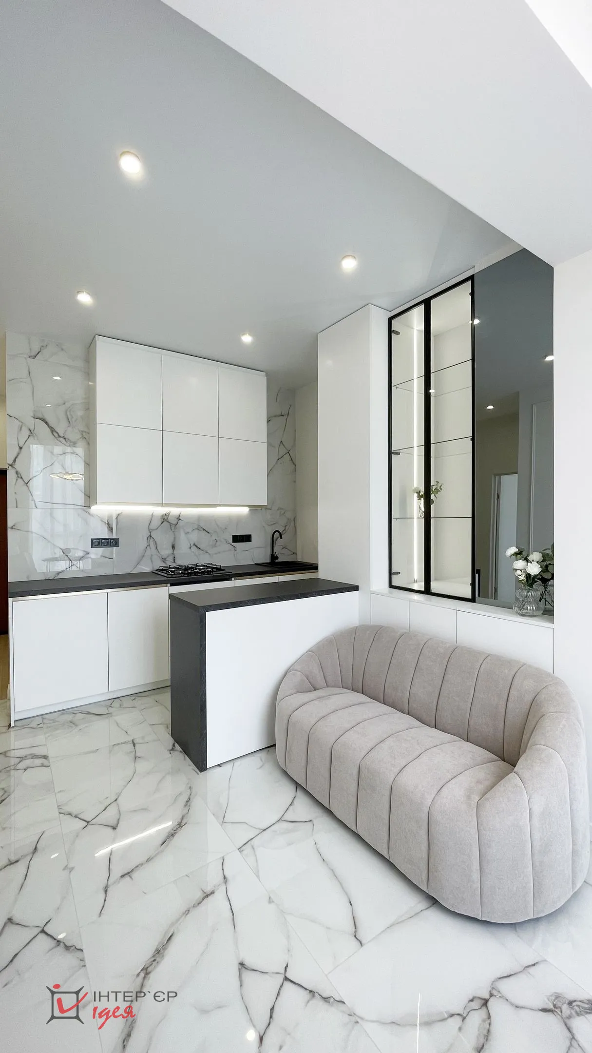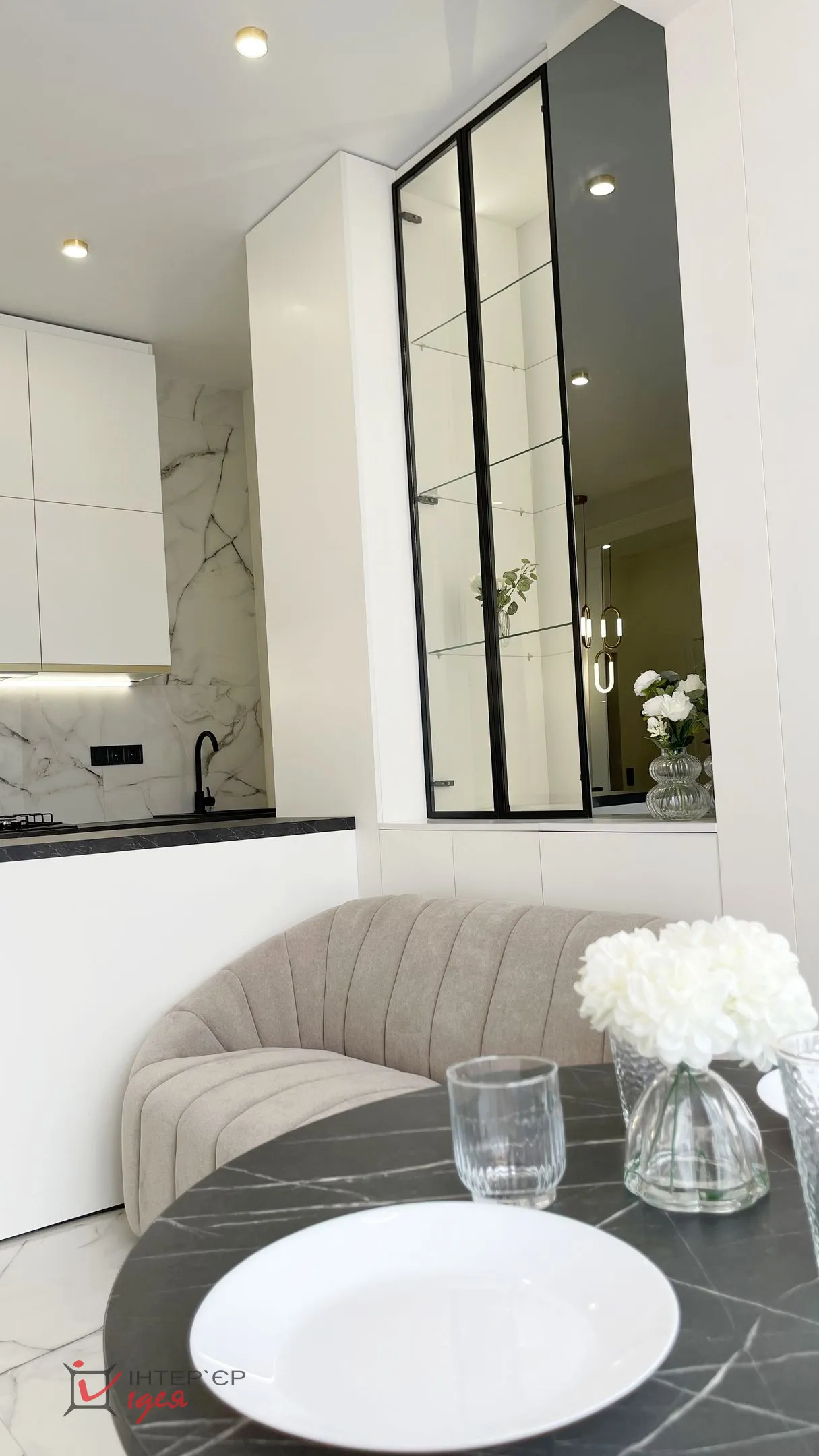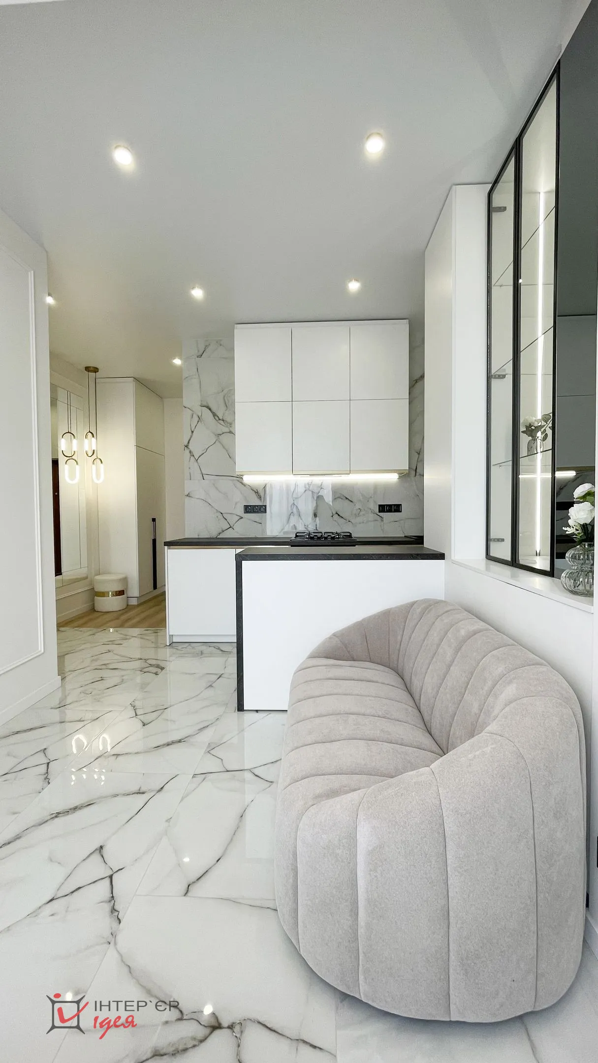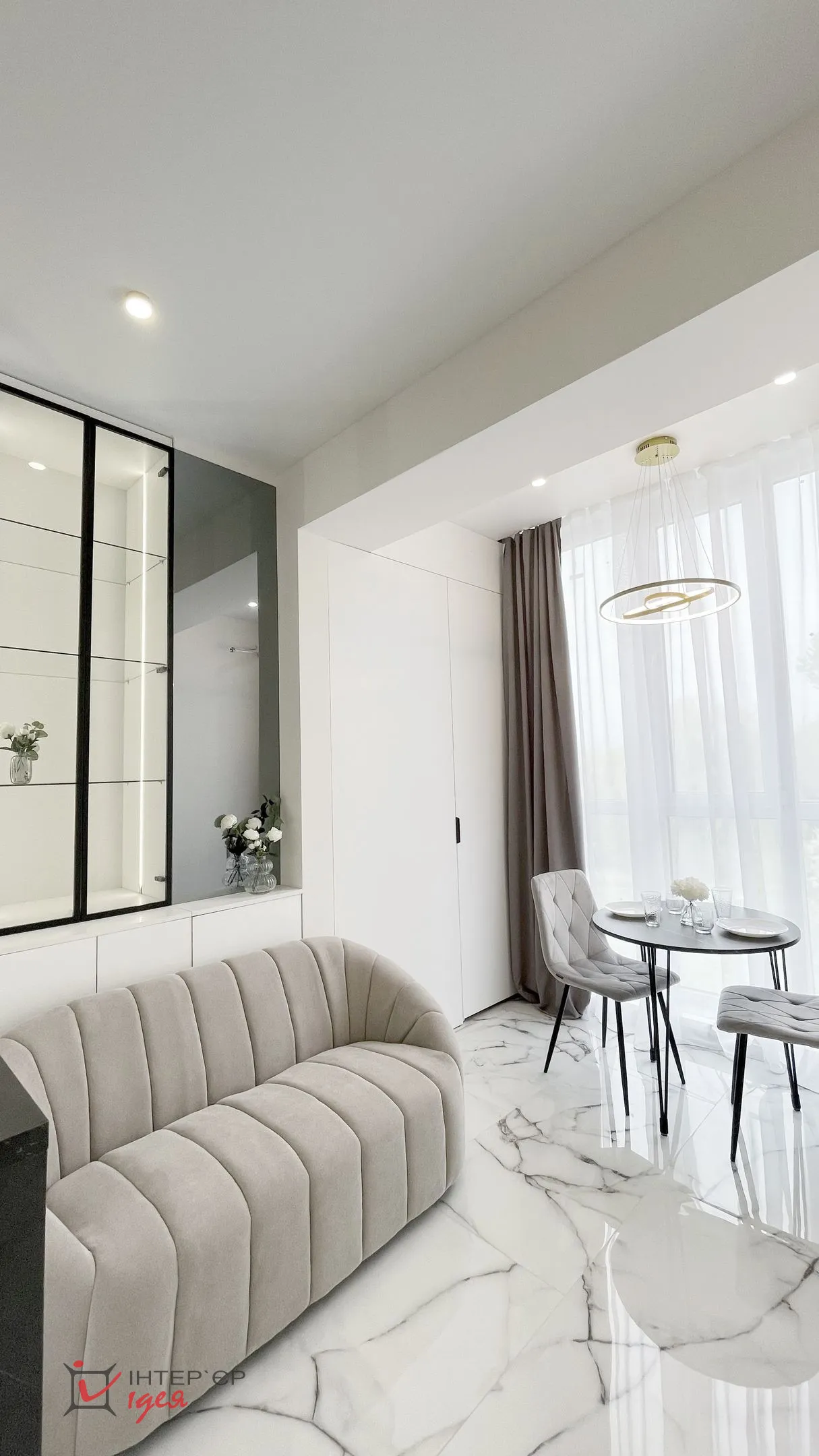 Wnętrze utrzymane jest w jasnych, spokojnych tonacjach, które dodają przestronności i lekkości. Wśród zastosowanych materiałów znajdują się szkło barwione, mosiądz oraz wielkoformatowe płytki – elementy nadające projektowi elegancji i nowoczesnego charakteru. Strefowe oświetlenie tworzy przytulną atmosferę o każdej porze dnia, podkreślając faktury i detale.