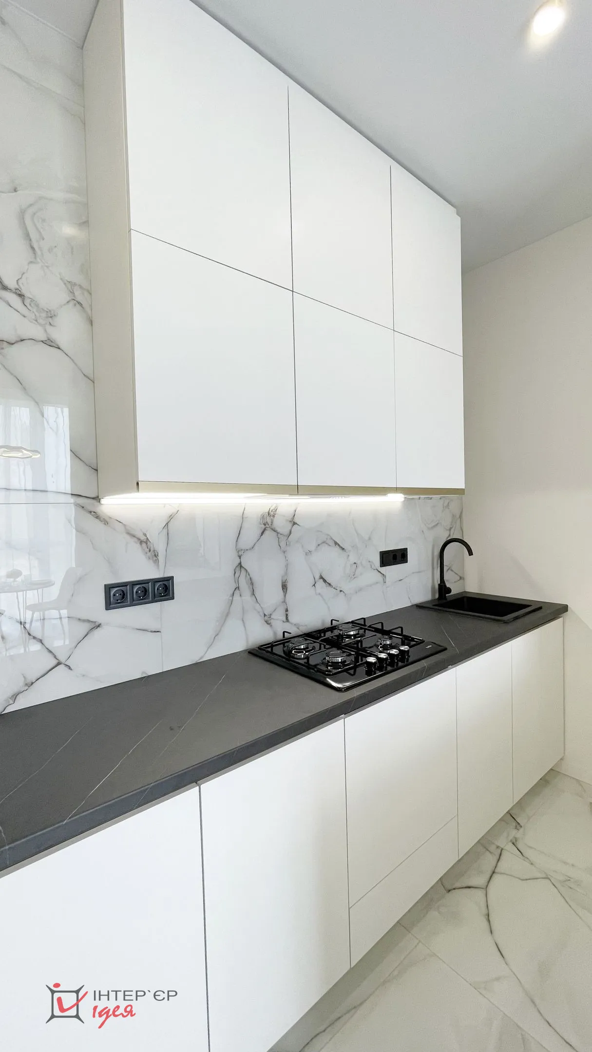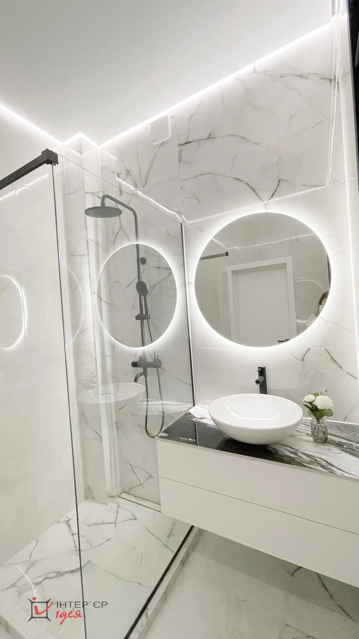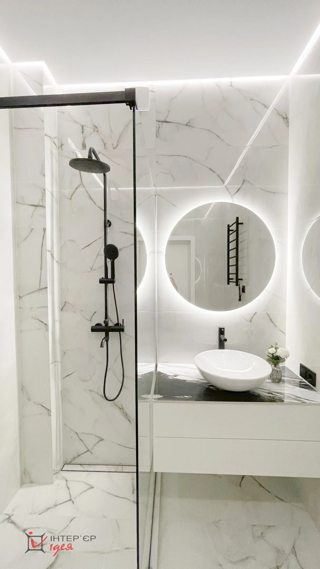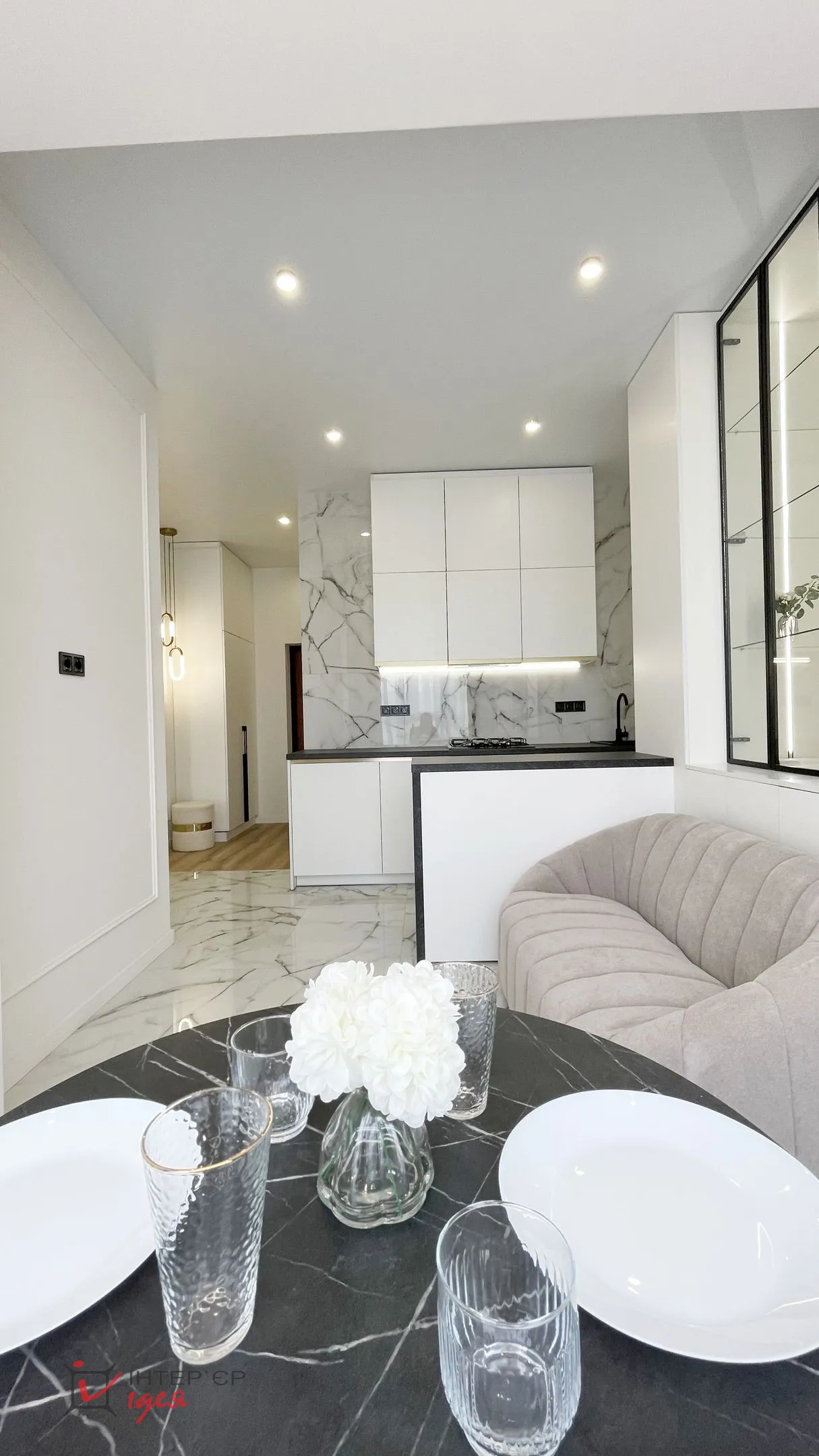 Wnętrze utrzymane jest w jasnych, spokojnych tonacjach, które dodają przestronności i lekkości. Wśród zastosowanych materiałów znajdują się szkło barwione, mosiądz oraz wielkoformatowe płytki – elementy nadające projektowi elegancji i nowoczesnego charakteru. Strefowe oświetlenie tworzy przytulną atmosferę o każdej porze dnia, podkreślając faktury i detale.