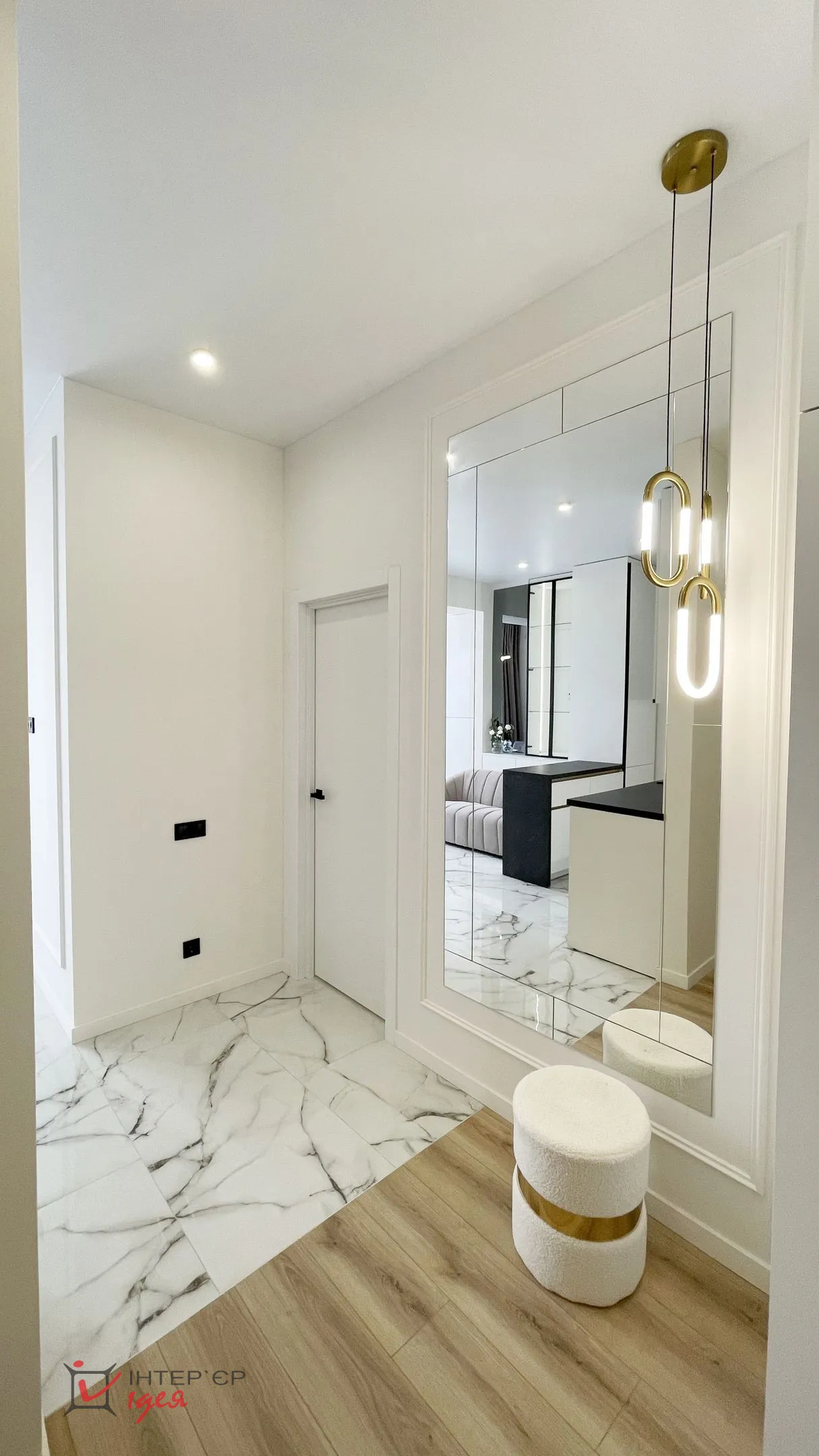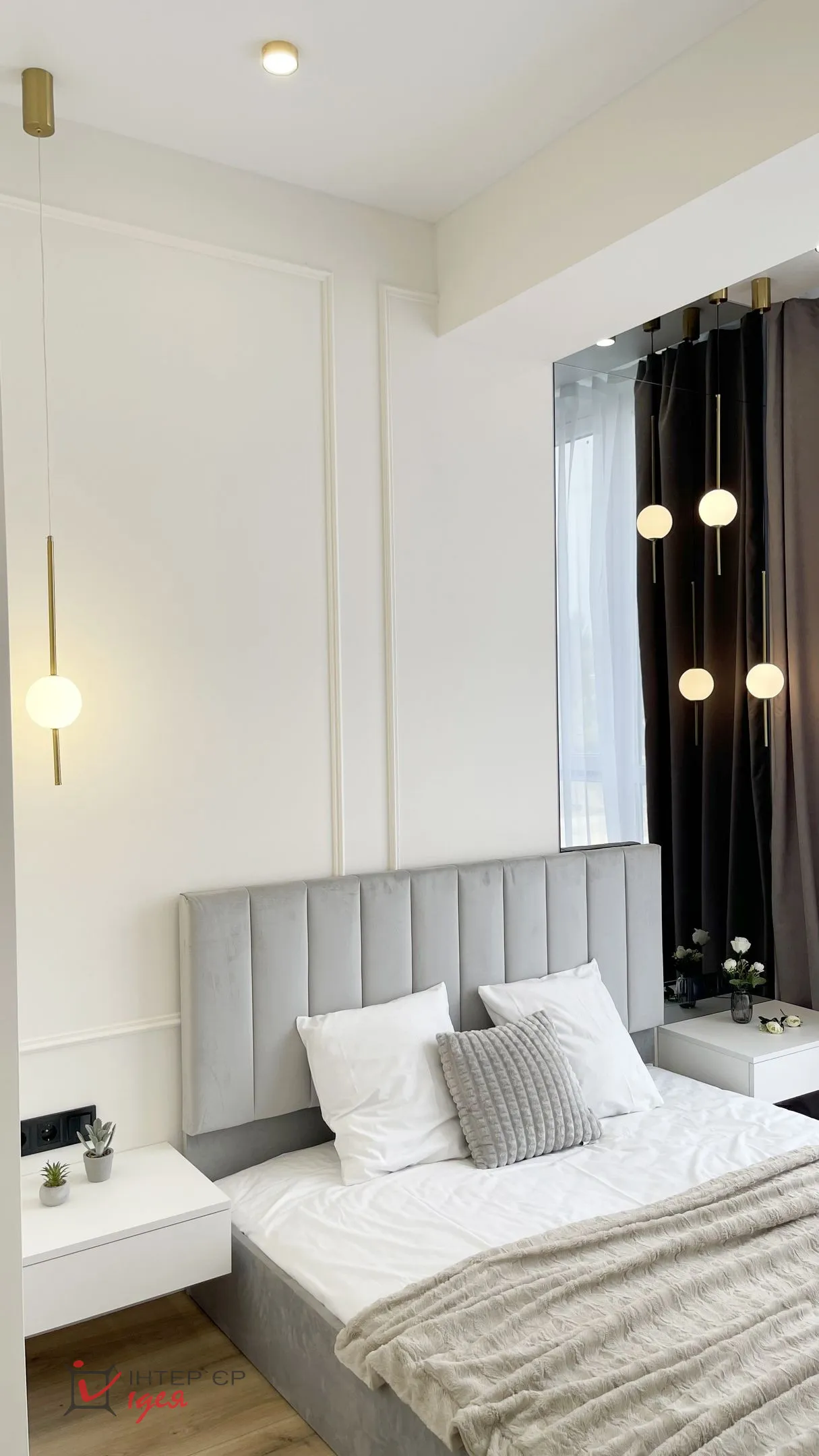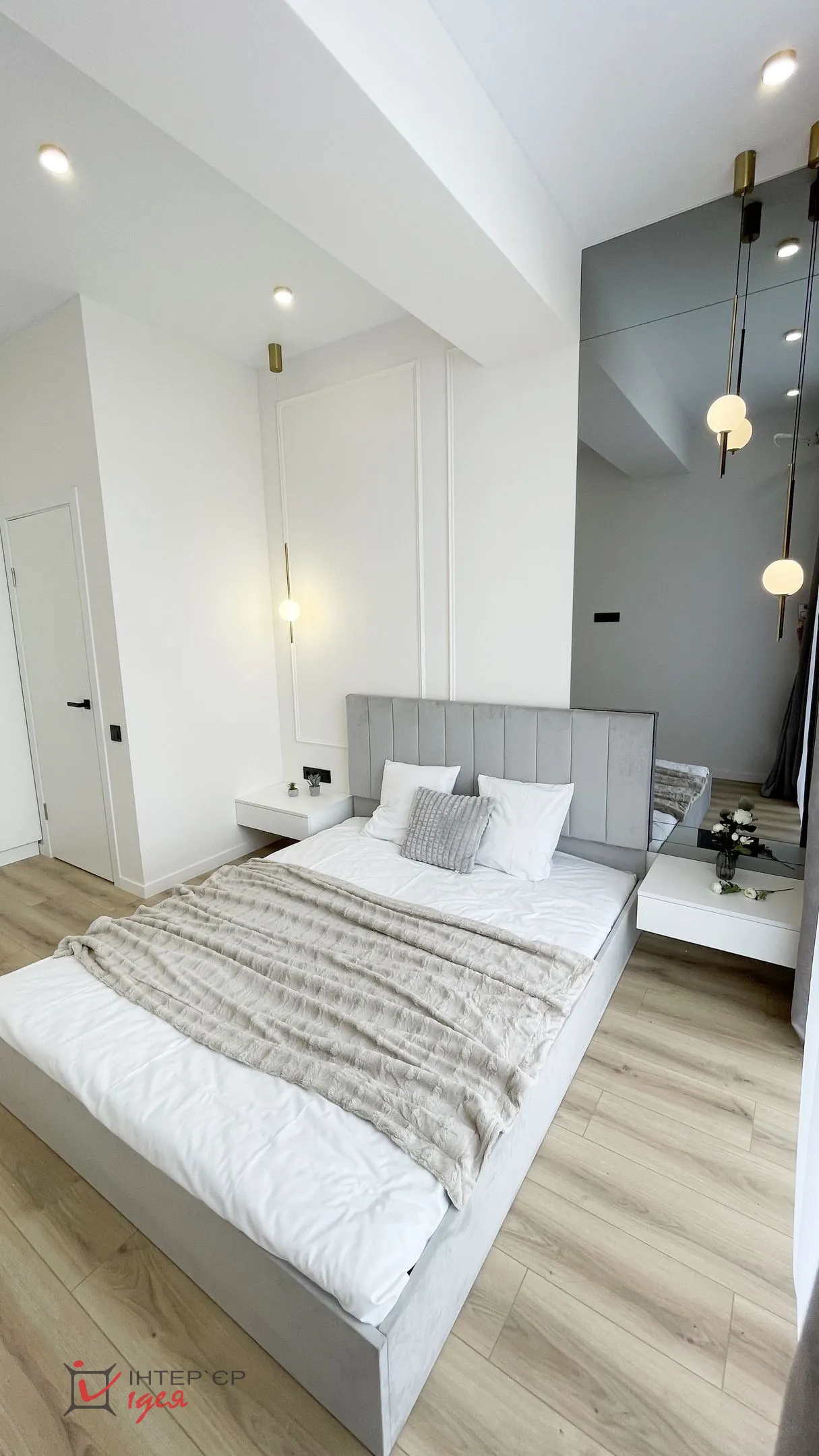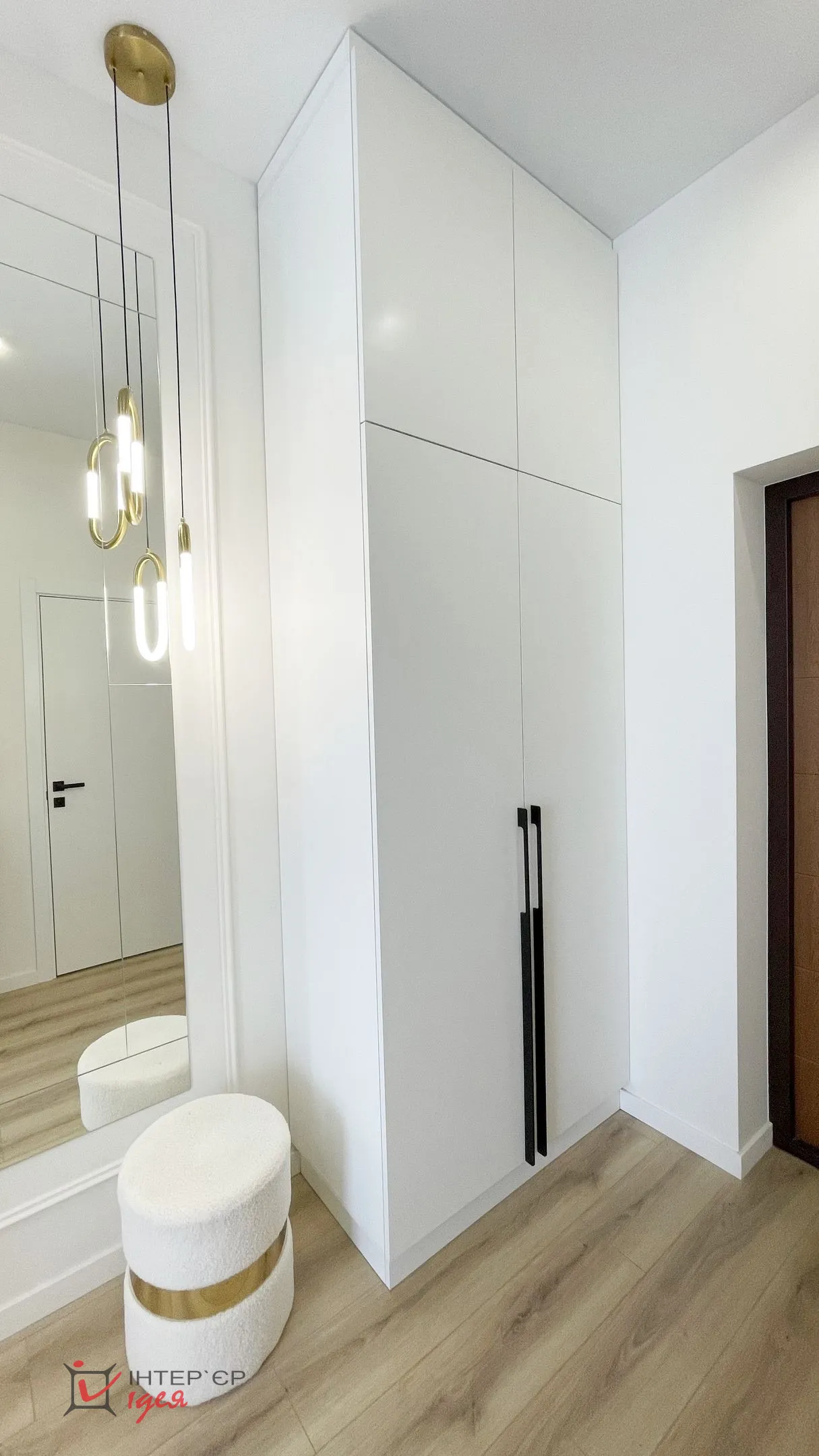 Przestrzeń została zaprojektowana z dbałością o każdy detal – od funkcjonalnego układu po harmonijną paletę kolorów. W mieszkaniu znajduje się salon z aneksem kuchennym, osobna sypialnia oraz łazienka. Dzięki przemyślanemu przeprojektowaniu udało się powiększyć przestrzeń dzienną oraz stworzyć wyodrębnioną strefę wejściową z pojemną szafą i dużym lustrem.